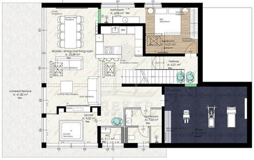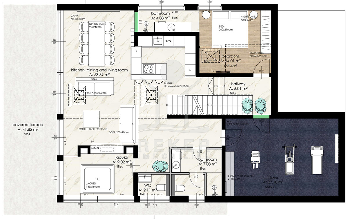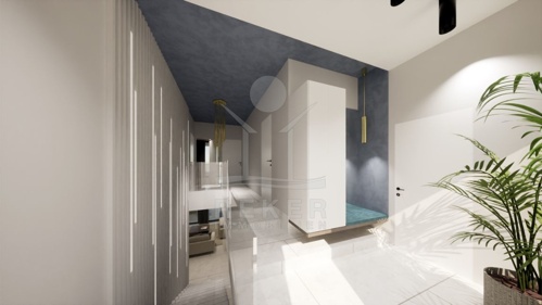Das Erdgeschoss bietet einen offenen Wohnraum mit einer modernen Küche und einem Essbereich sowie ein Schlafzimmer mit eigenem Badezimmer. Außerdem verfügt die Wohnung über einen geräumigen Fitnessraum und einen Jacuzzi zur Entspannung. Ein Kamin im Wohnzimmer sorgt für eine gemütliche Atmosphäre. Zusätzlich gibt es ein Gäste-WC.