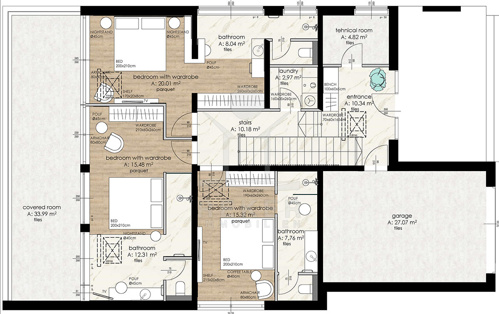 Im Obergeschoss befinden sich drei Schlafzimmer, jedes mit eigener Badezimmer. Hier können Sie absolute Privatsphäre und Komfort genießen. Eine Waschküche sowie ein Balkon mit Meerblick runden das Angebot ab.