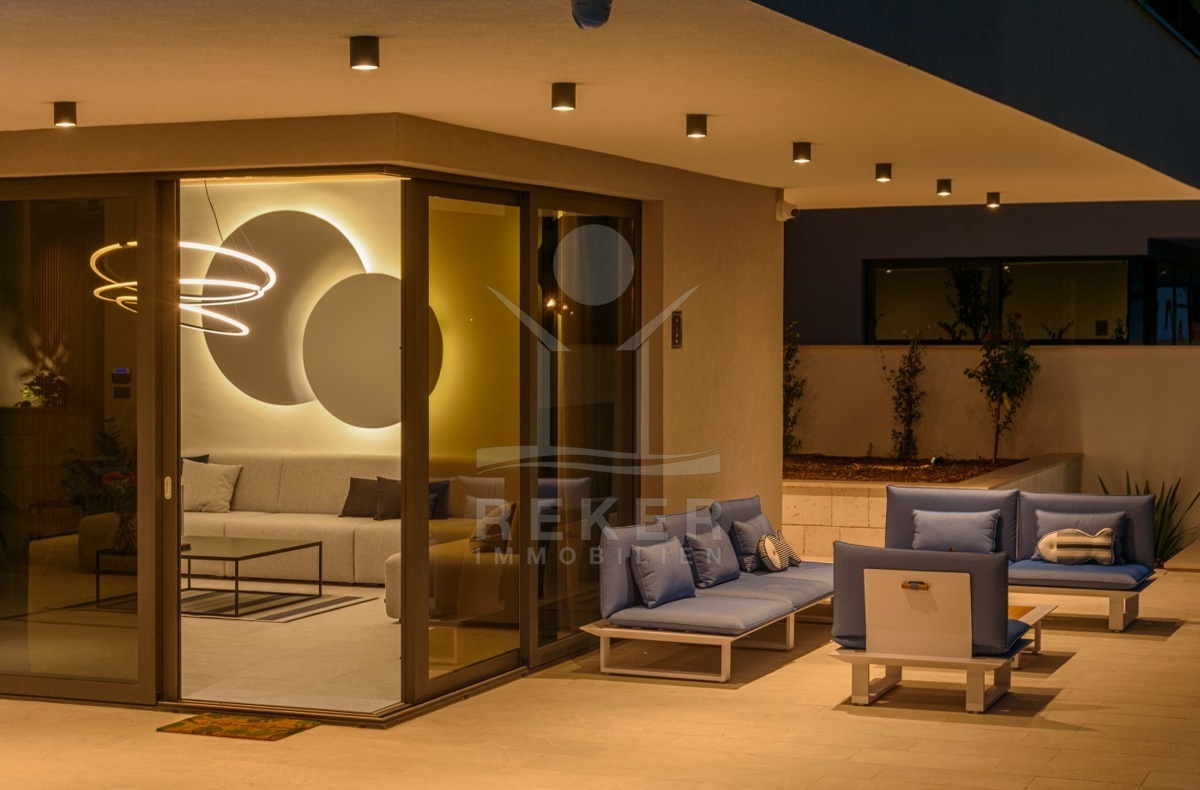 Herzlich Willkommen in der magischen Luxus-Welt! Die sagenhafte 430 m² Wohnfläche umfassende Villa Lucy Cherry steht auf einem etwa 800 m² großen, automatisch bewässerten Grundstück und beinhaltet im Erdgeschoss ein geräumiges Wohnzimmer mit großen Glaswänden und eine erstklassige Küche mit großem Essbereich.