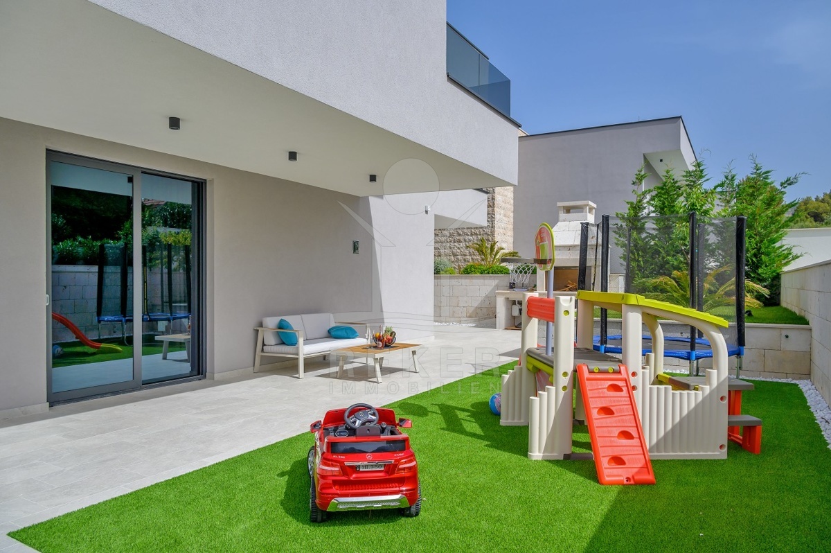 Aus dem Wohnzimmer gelangen Sie direkt auf die teilweise überdachte Terrasse, auf der Sie auf dem Steingrill zubereitete Köstlichkeiten genießen und sich von der mediterranen Sonne verwöhnen lassen können. Für die Kinder gibt es einen eigenen Spielbereich.