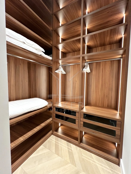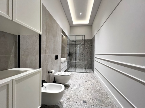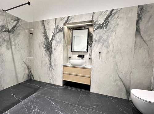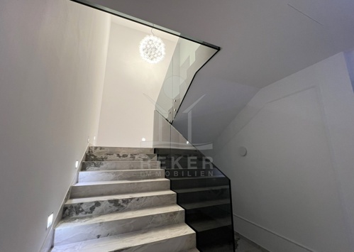 Die Wohnung bietet auf rund 114 m² viel Raum und Stil. Die Atmosphäre ist klar, ruhig, hochwertig. Das Herzstück ist der großzügige Wohnbereich mit offener Küche und Essplatz. Hier wurde auf jedes Detail geachtet – von Miele-Geräten über klare Fronten bis hin zur stimmigen Möblierung. Zwei Schlafzimmer mit jeweils eigenem Bad sorgen für Privatsphäre. Eines der Schlafzimmer bietet dazu noch einen begehbaren Kleiderschrank mit edler Holzverkleidung und Beleuchtung. Das dritte Bad liegt separat – perfekt für Gäste. Die Bäder: echte Highlights mit Fußbodenheizung, großformatigen Fliesen in Marmoroptik, schwarzen Armaturen und stimmigem Lichtkonzept. Die gesamte Wohnung ist klimatisiert und wird über Wärmepumpe beheizt – modern, effizient, leise.