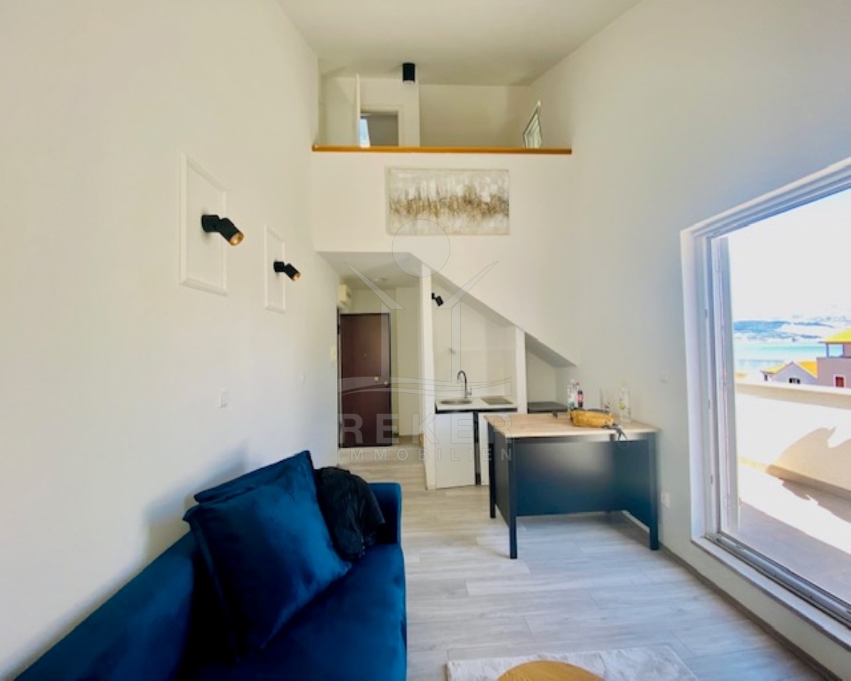 Die Wohnung (57 m²) wird komplett möbliert verkauft und ist mit einer Klimaanlage ausgestattet, die für angenehme Temperaturen sorgt. Im 1. Stock befindet sich eine kleine, gut ausgestattete Küche, die direkt in ein einladendes Wohnzimmer übergeht. Das Wohnzimmer bietet den Zugang zu einem großzügigen Balkon, der mit einem herrlichen Blick auf das Meer zum Entspannen einlädt. Hier können Sie die sanfte Meeresbrise genießen und unvergessliche Sonnenuntergänge erleben. Die Innentreppe führt in den Galerieteil der Wohnung, wo sich ein gemütliches Schlafzimmer und ein modernes Badezimmer befinden. Diese private Etage ist der perfekte Rückzugsort für Ruhe und Erholung.