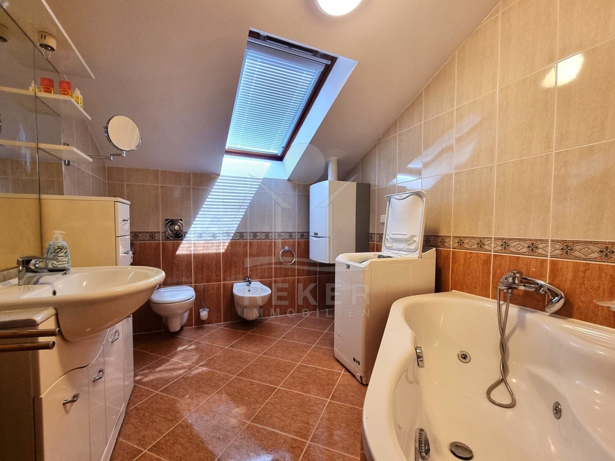 Eine interne Wendeltreppe führt ins Dachgeschoss mit 3 Schlafzimmern und einem stilvollen Badezimmer. Abgerundet wird das Angebot durch eine Garage sowie eine gemütliche Taverne im Keller mit 11,15 m².