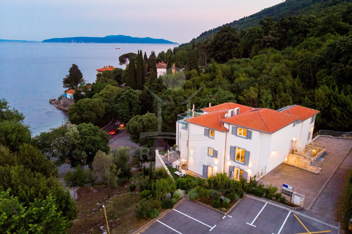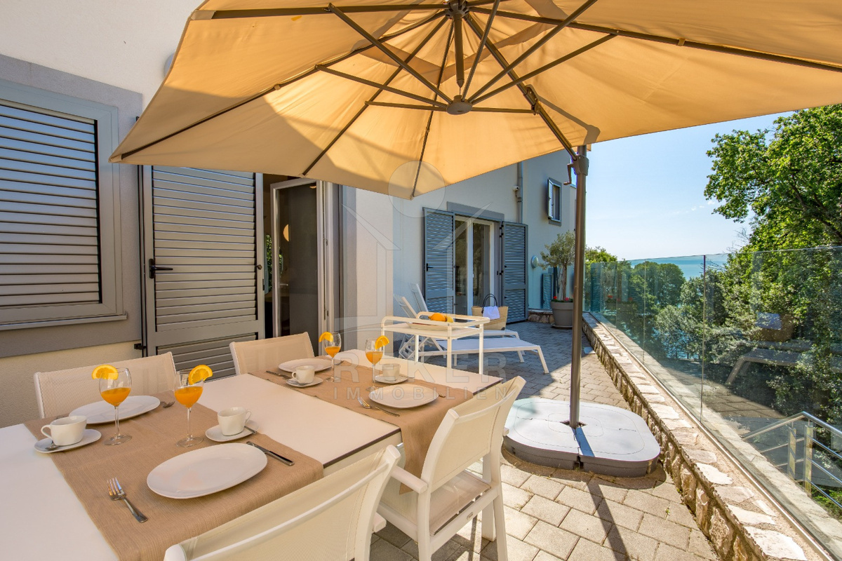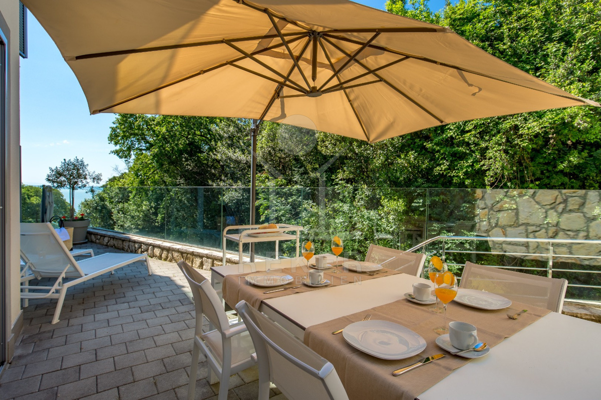 Nur ein paar Kilometer von Opatija entfernt liegt diese moderne Villa … direkt an der Küste, nur 50 Meter vom Meer. Dank ihrer Lage am Hang haben Sie freien Blick auf die Adria, ganz ohne störende Bebauung davor. Und weil rundherum dichter Baumbestand ist und der nächste Nachbar etwa 100 Meter entfernt wohnt, bleibt es ruhig. Richtig ruhig. Klingt das nach Rückzug? Ist es auch.