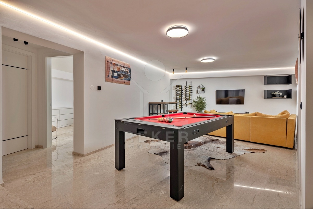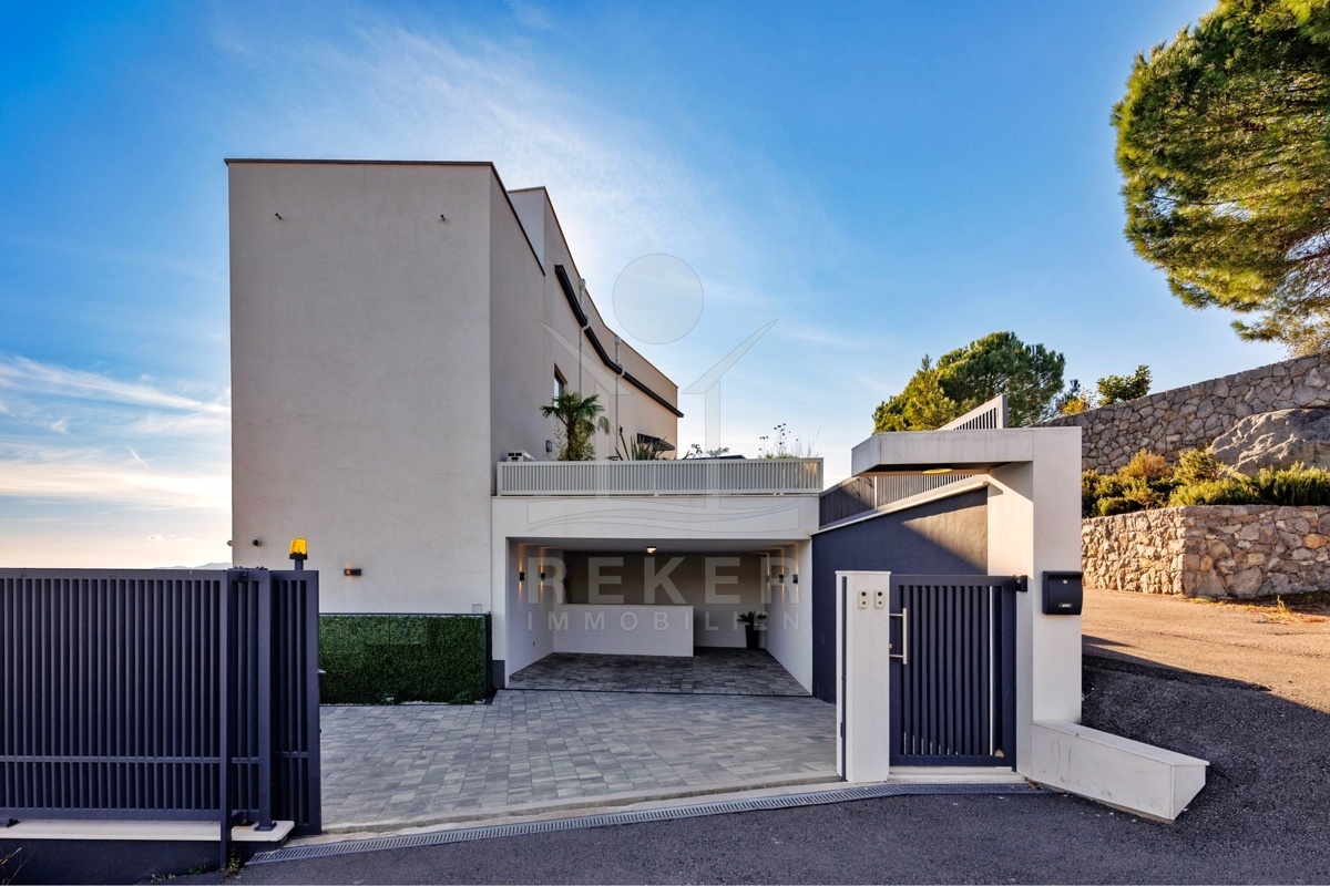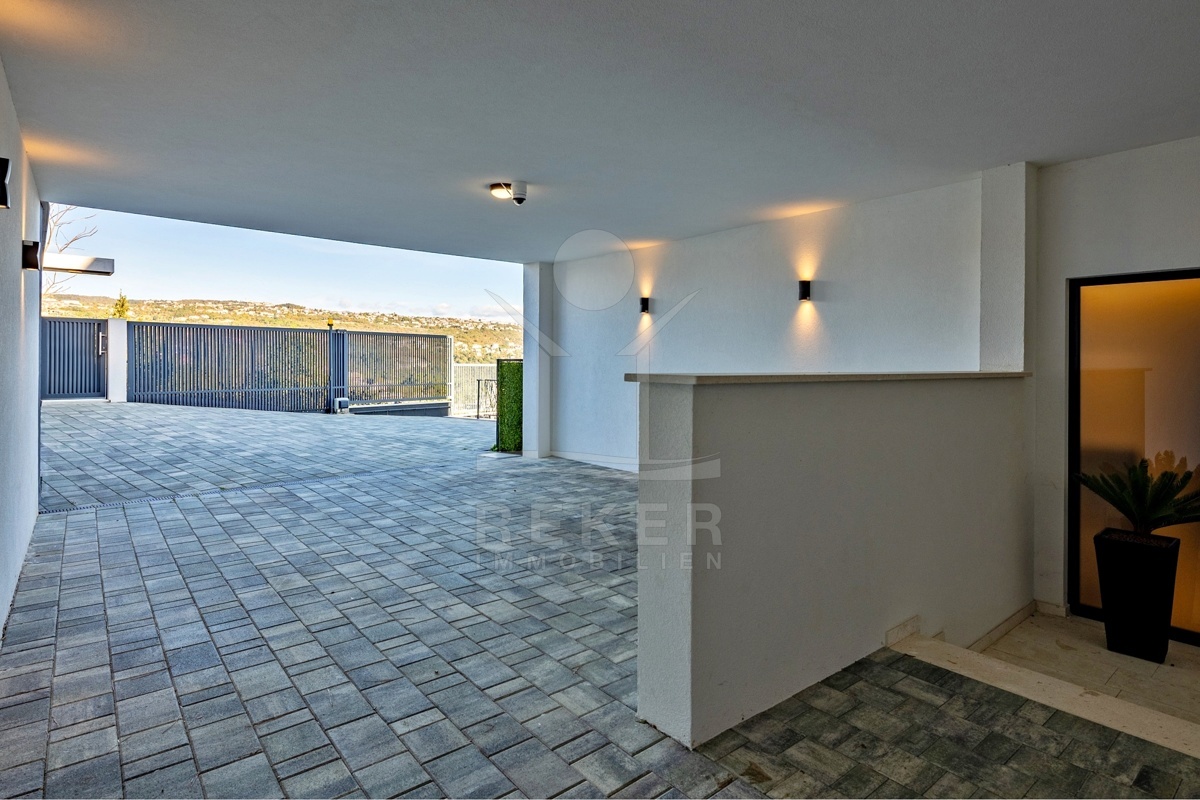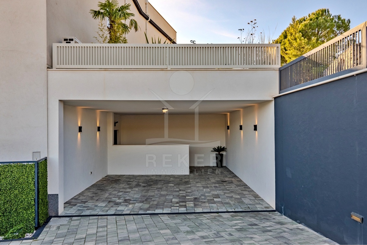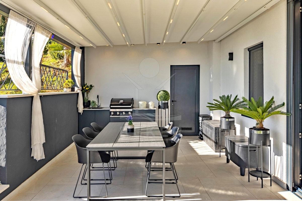 Ein Garten wie dieser ist in Opatija selten: gepflegt, einladend, privat. Die große Terrasse mit Sommerküche ist mehr als ein Außenbereich … sie wird zum zweiten Wohnzimmer. Automatische Pergolen geben Schatten oder Sonne, wie Sie es gerade brauchen. Der Esstisch draußen wird schnell zum Lieblingsplatz. Und wenn Gäste da sind, genießen auch sie ihre eigene Terrasse an der separaten Wohnung. Vier Parkplätze machen Schluss mit der Parkplatzsuche. Zwei davon überdacht, ideal auch bei längerer Abwesenheit.