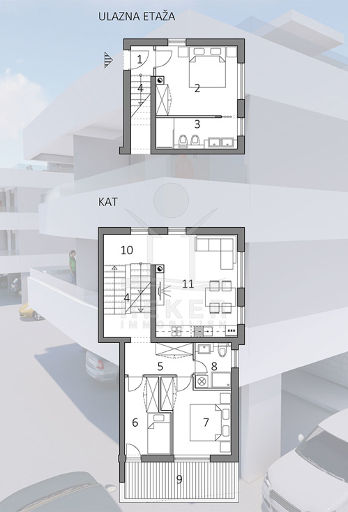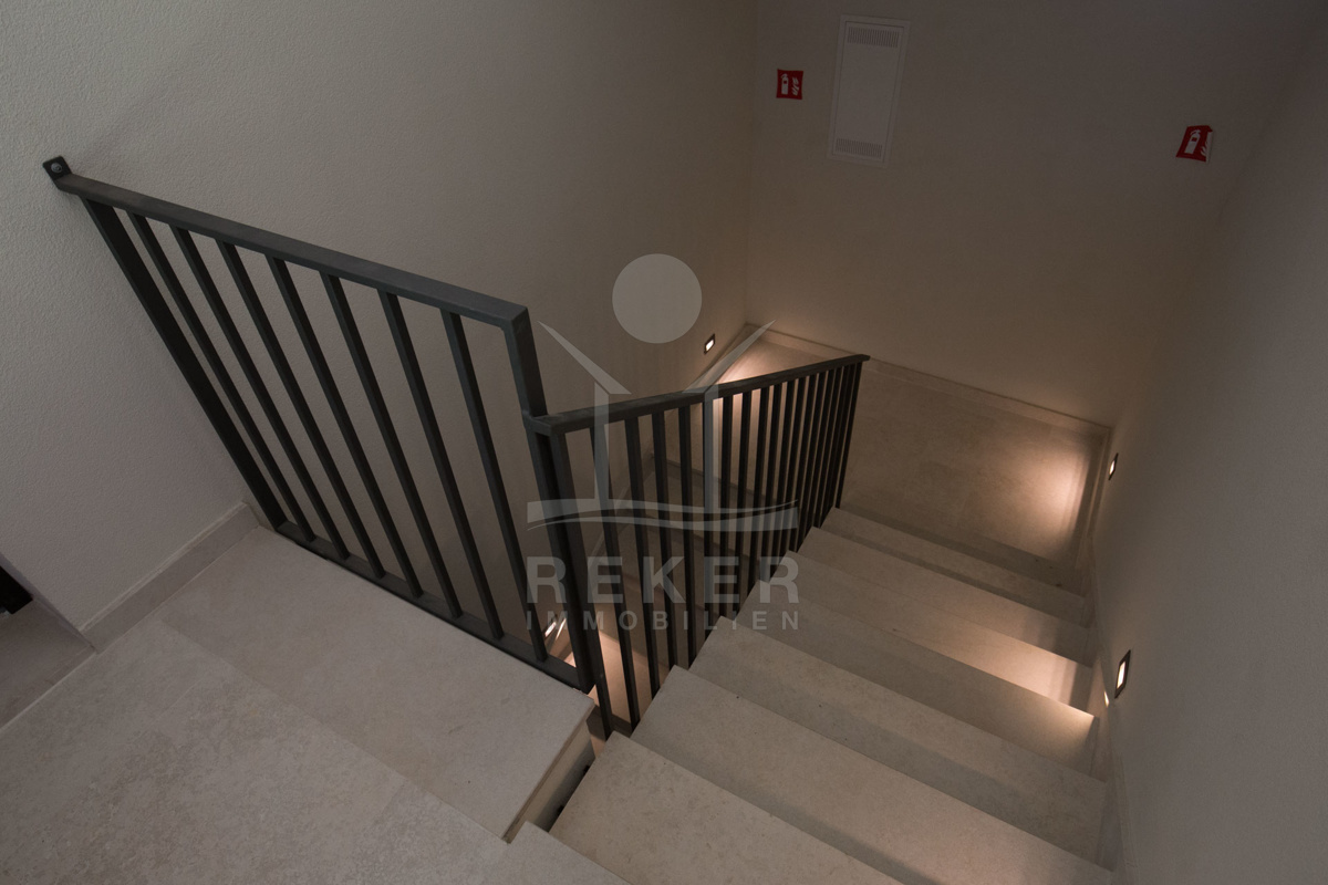 Die klimatisierte Wohnung im ersten und zweiten Stock bietet auf insgesamt zwei Etagen viel Raum und Freiheit für modernes Wohnen. Im ersten Stock befindet sich ein geräumiges Schlafzimmer mit eigenem Bad und eine Eingangshalle.