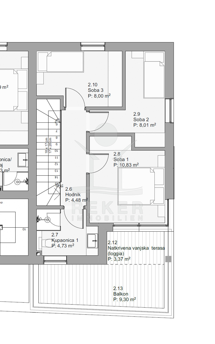 Im Obergeschoss liegen drei Schlafzimmer und ein Badezimmer. Alle Räume sind hell, gut strukturiert und bieten ausreichend Platz. Die überdurchschnittliche Raumhöhe und die präzise Bauausführung verleihen der Wohnung eine besondere Qualität, die man spürt.