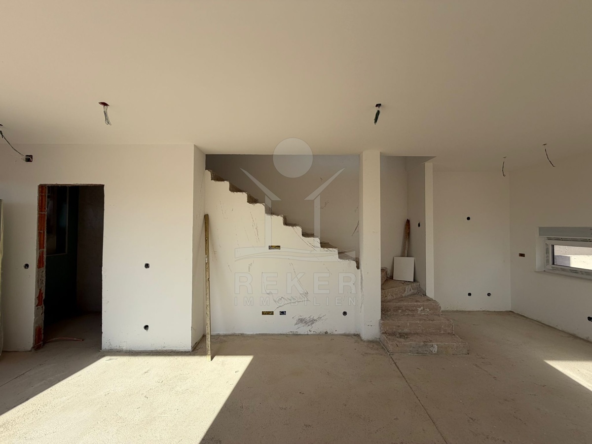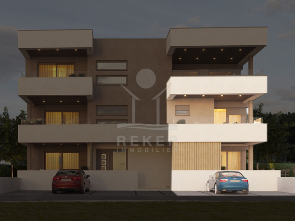 Das Gebäude umfasst vier Wohnungen auf drei Ebenen. Im Erdgeschoss und im ersten Stock entstehen zwei identische Einheiten. Darüber befindet sich das Penthouse mit großzügigem Blick auf das Meer. Eine weitere Wohnung erstreckt sich über zwei Etagen, unten mit Wohnbereich, oben mit Schlafzimmern. Jede Einheit bietet eine eigene Terrasse oder einen Balkon, perfekt, um die Umgebung auf sich wirken zu lassen. Die Architektur überzeugt mit klarer, moderner Formensprache und einem Fokus auf Raumgefühl und Aussicht. Für jede Wohnung steht ein eigener Parkplatz direkt vor dem Haus zur Verfügung.