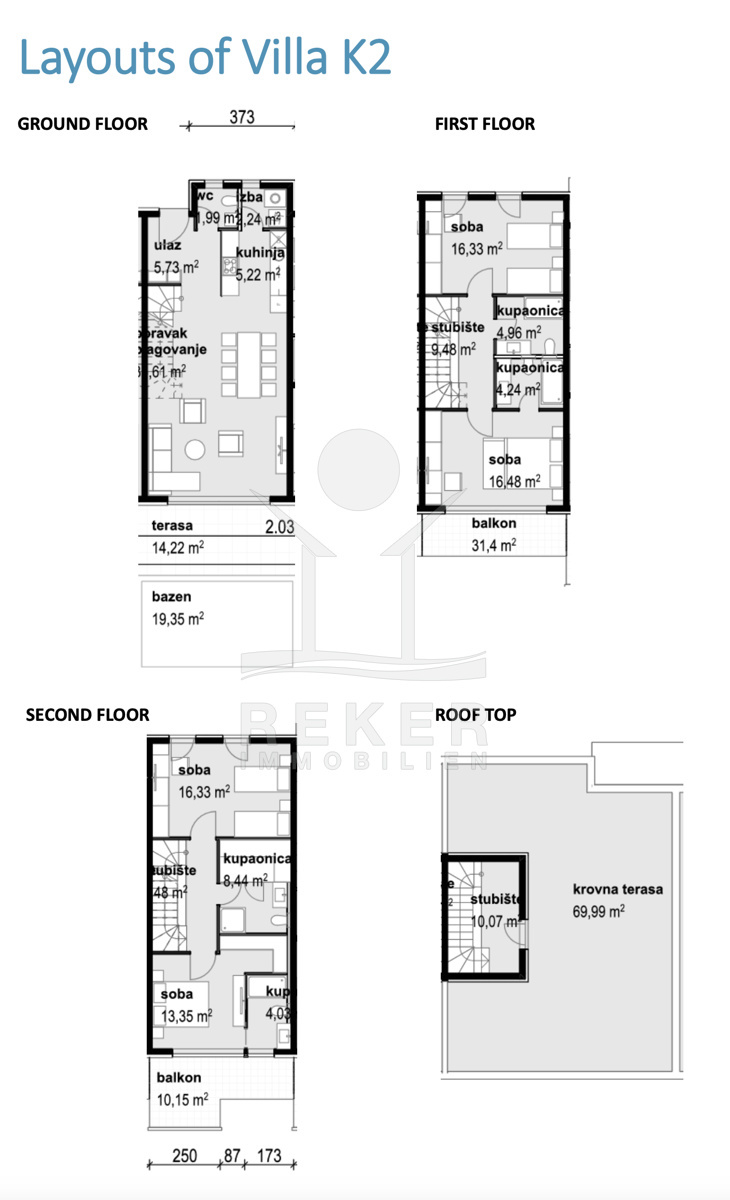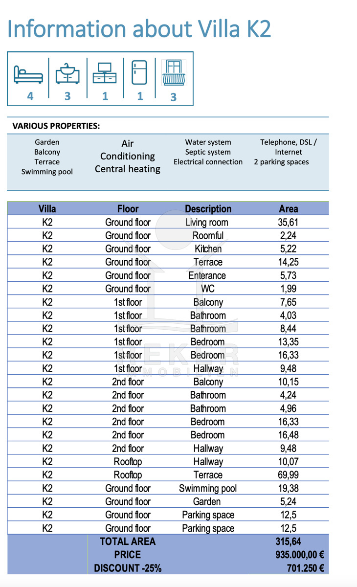 Die geräumige Wohnung wird mit einer Klimaanlage ausgestattet. Das Erdgeschoss verfügt über ein offenes Wohnkonzept mit Ess- und Küchenbereich, Zugang zur überdachten Terrasse und zum Pool, ein WC und eine Speisekammer. Auf dem ersten Stockwerk befinden sich zwei Schlafzimmer, jedes mit eigenem Badezimmer. Eines der Schlafzimmer bietet zudem ein eigenes Bad für maximalen Komfort. Im zweiten Stockwerk erwarten Sie zwei weitere Schlafzimmer mit jeweils eigenen Badezimmern. Von hier aus genießen Sie einen atemberaubenden Panoramablick auf das Meer. Auf der Dachterrasse in der dritten Etage können Sie auf 69,99 m² eine wundervolle Aussicht und Umgebung genießen. Erleben Sie hier Sonnenuntergänge, den Sternenhimmel und Zeit im Freien in netter Gesellschaft.
