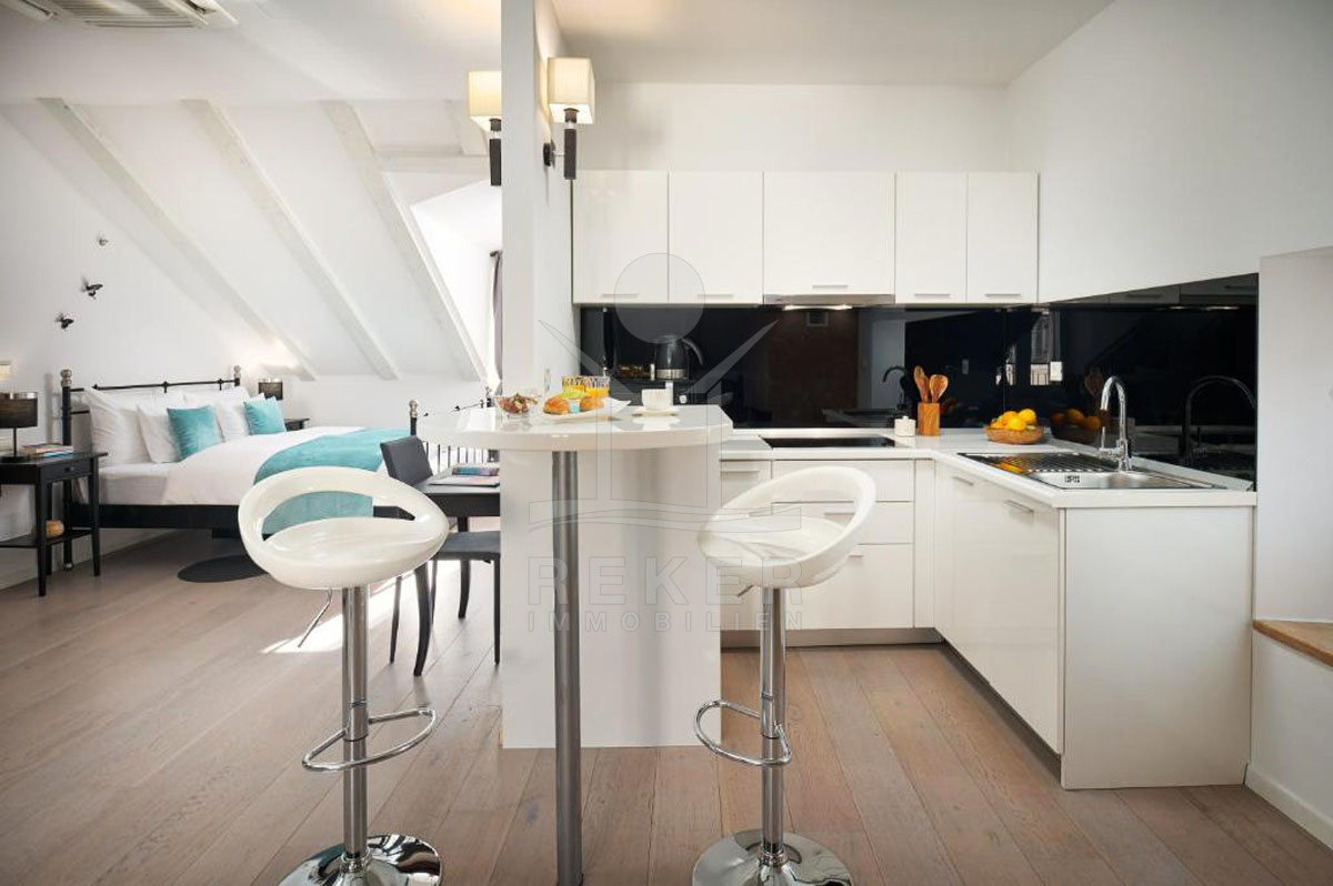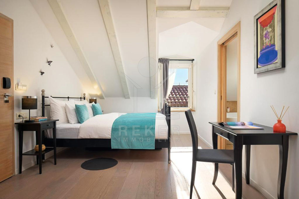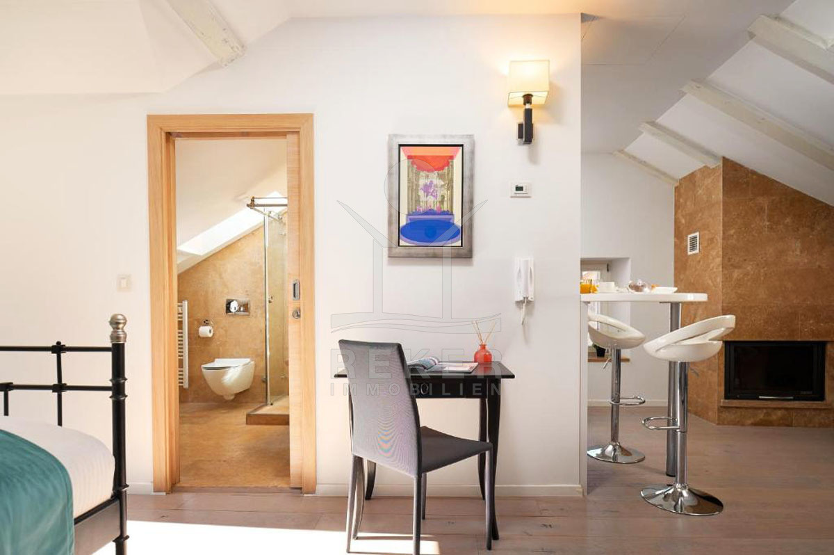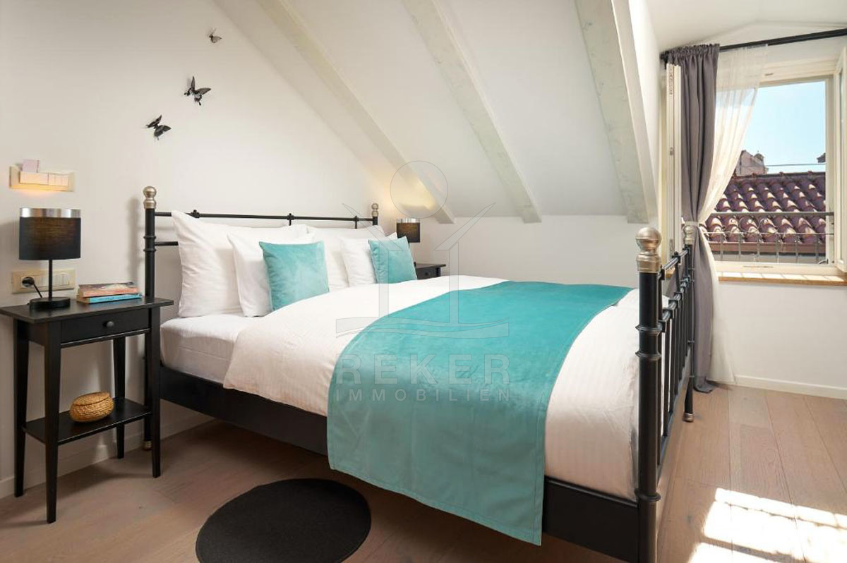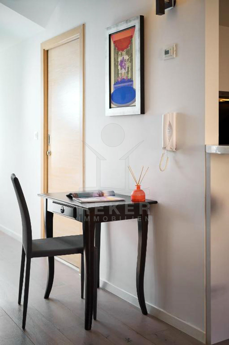 Die Wohnung wird vollständig möbliert verkauft und ist in drei separate Einheiten unterteilt, darunter eine luxuriöse Wohnung im Dachgeschoss. Die lichtdurchfluteten Räume sind größtenteils nach Süden ausgerichtet und bieten eine angenehme, luftige Atmosphäre.