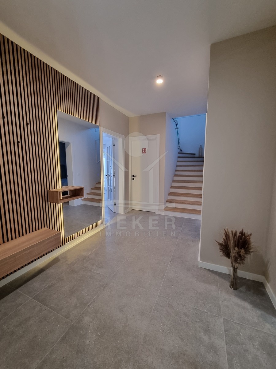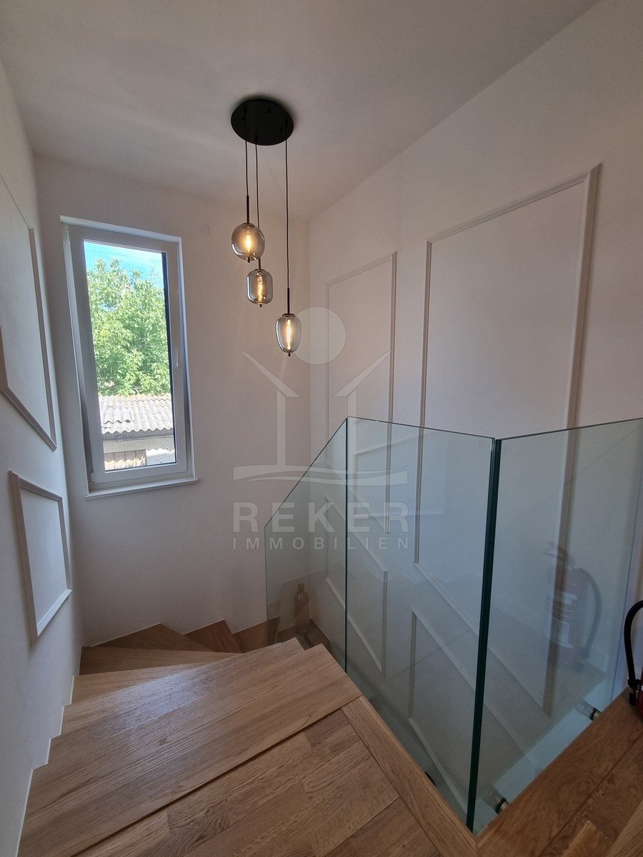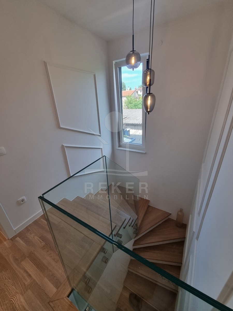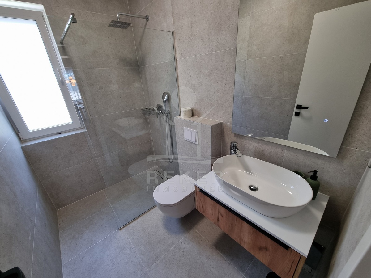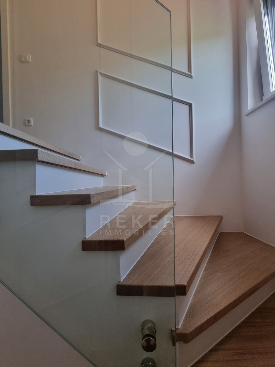 Die Treppe führt nach oben. Dort warten zwei weitere Schlafzimmer und zwei moderne Bäder – jeweils direkt angeschlossen. Alle Räume sind hochwertig ausgestattet: große Fliesen, deckenhoch verfliestes Bad, bodengleiche Dusche, stilvolle Armaturen. Im Obergeschoss öffnet sich ein Balkon mit Blick in Richtung Meer.