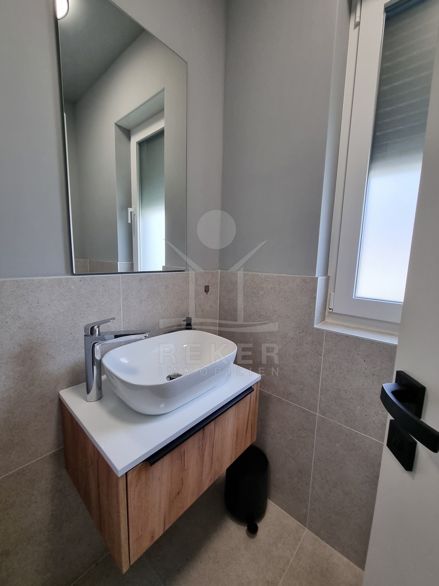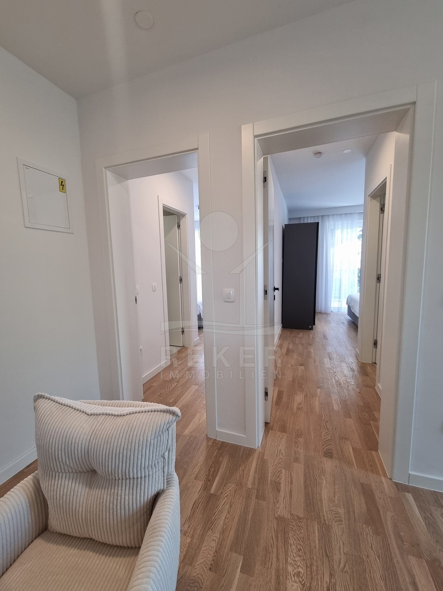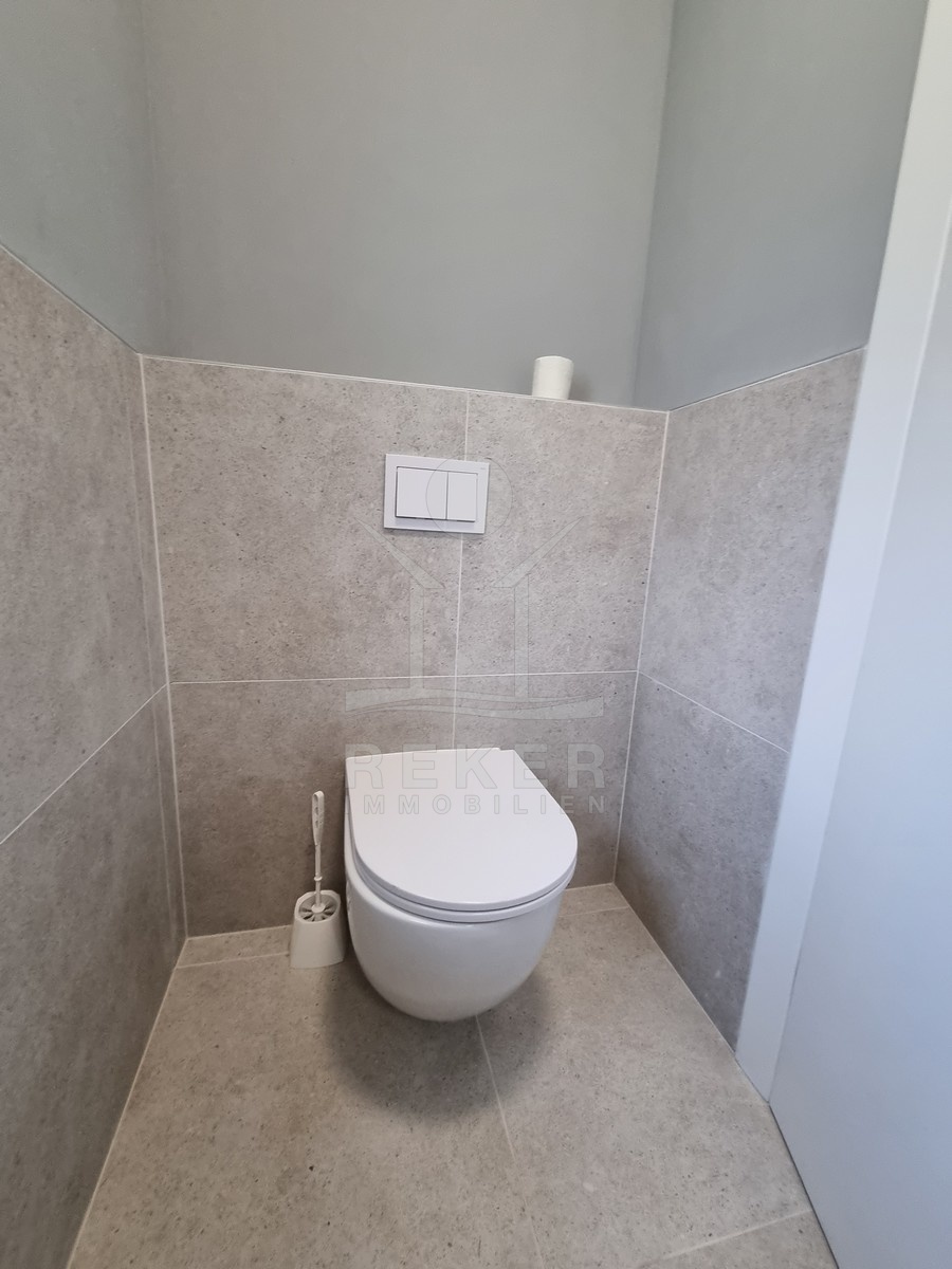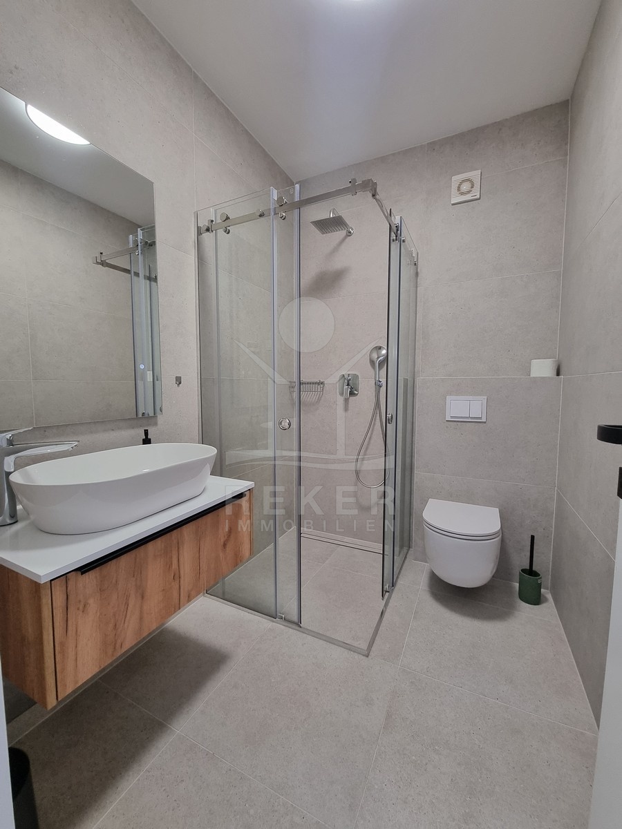 Die Treppe führt nach oben. Dort warten zwei weitere Schlafzimmer und zwei moderne Bäder – jeweils direkt angeschlossen. Alle Räume sind hochwertig ausgestattet: große Fliesen, deckenhoch verfliestes Bad, bodengleiche Dusche, stilvolle Armaturen. Im Obergeschoss öffnet sich ein Balkon mit Blick in Richtung Meer.