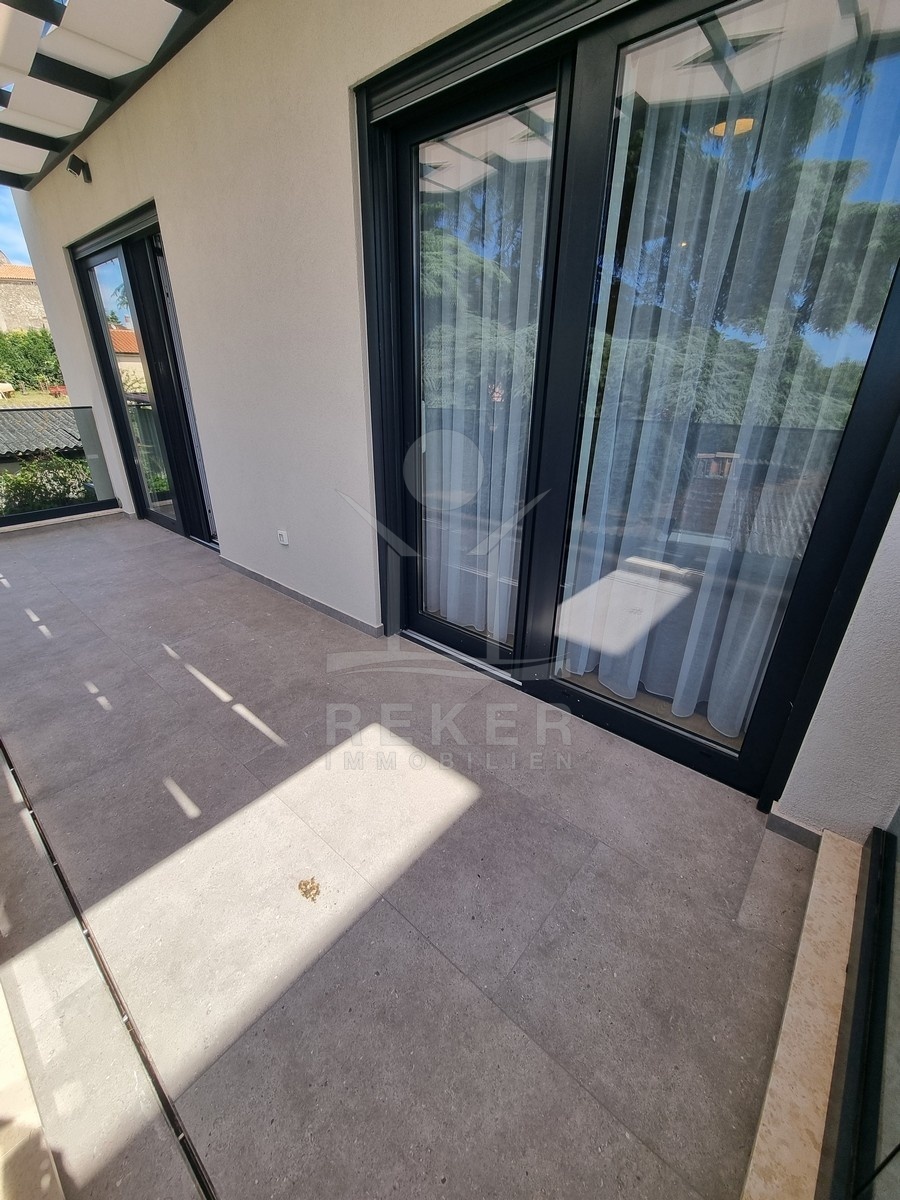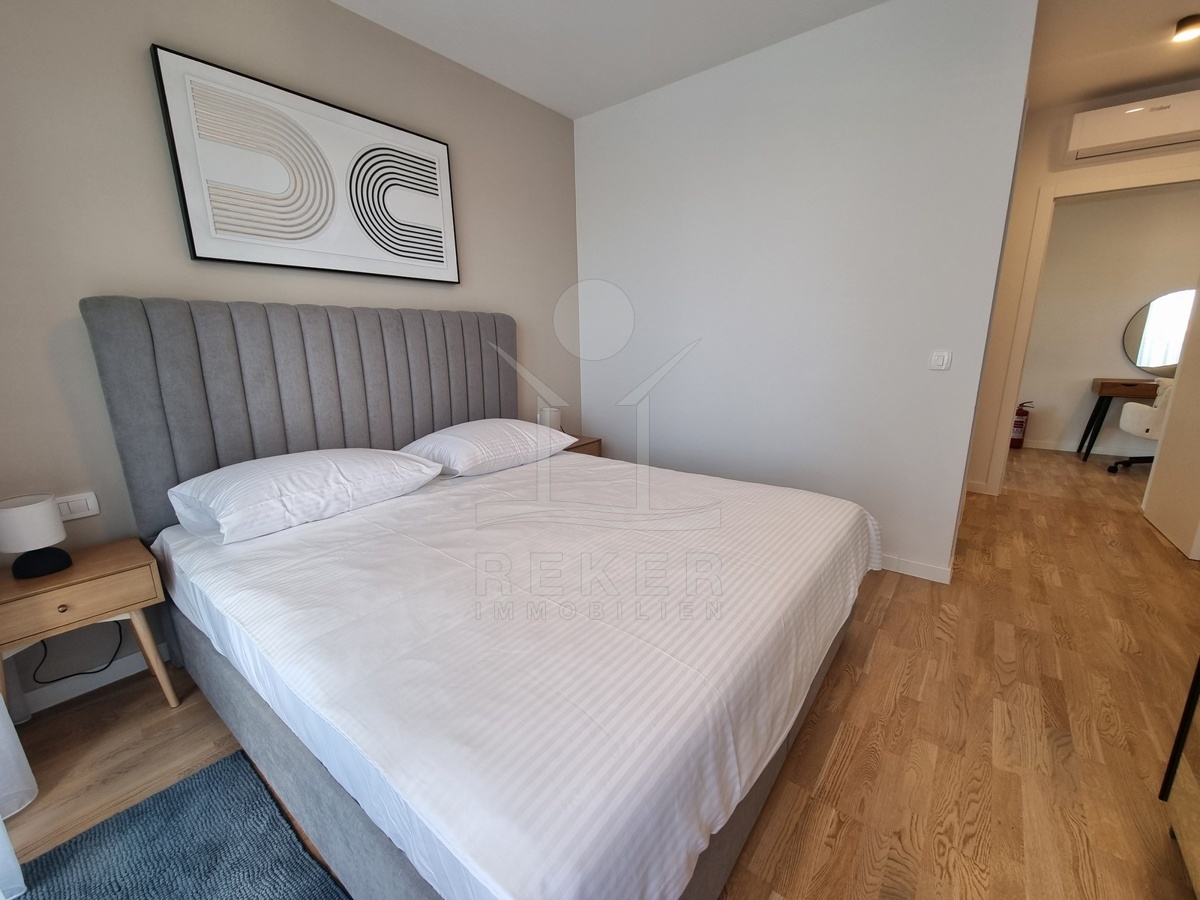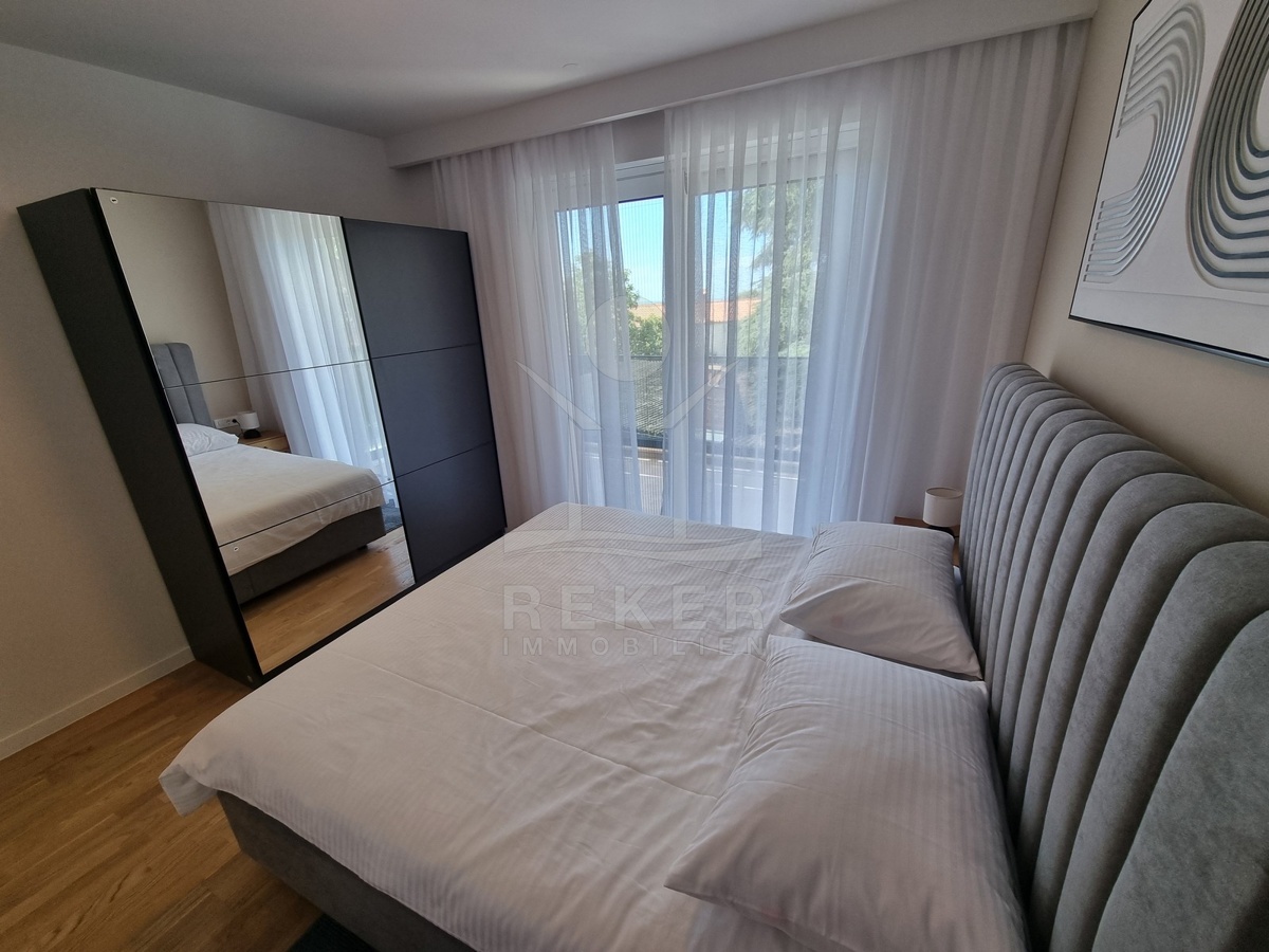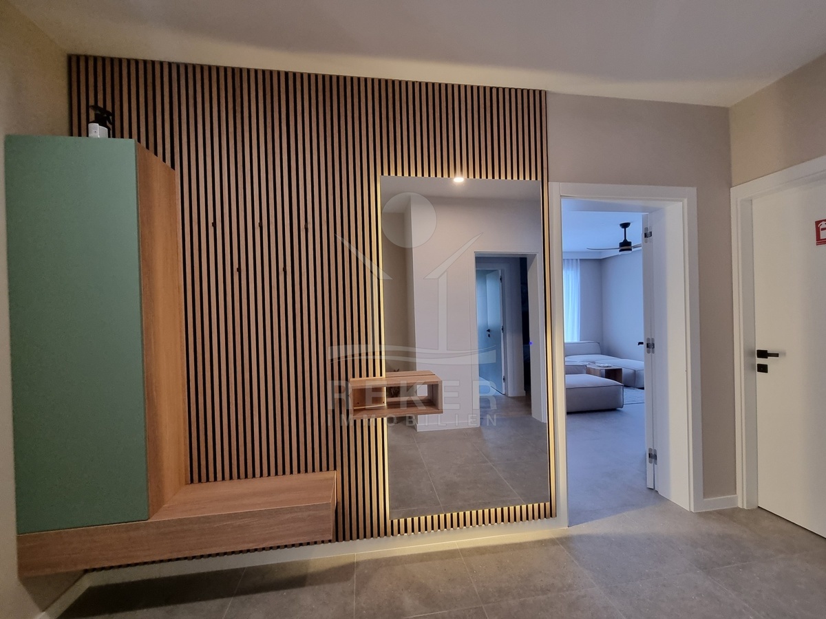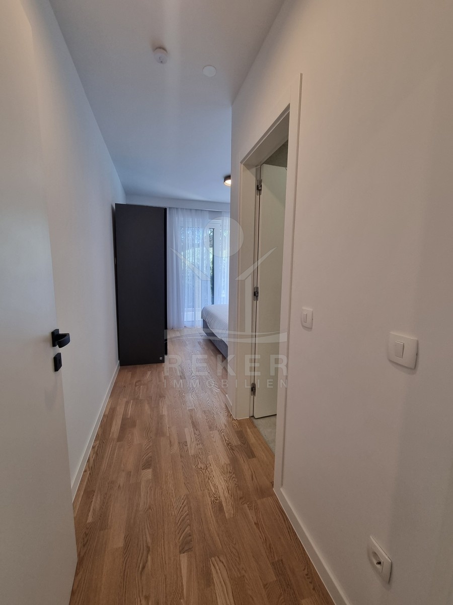 Die Treppe führt nach oben. Dort warten zwei weitere Schlafzimmer und zwei moderne Bäder – jeweils direkt angeschlossen. Alle Räume sind hochwertig ausgestattet: große Fliesen, deckenhoch verfliestes Bad, bodengleiche Dusche, stilvolle Armaturen. Im Obergeschoss öffnet sich ein Balkon mit Blick in Richtung Meer.