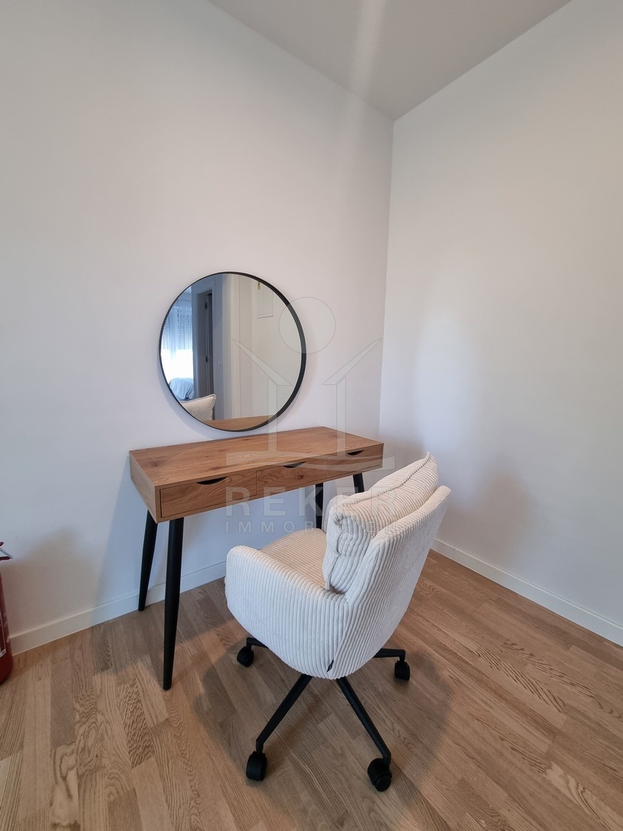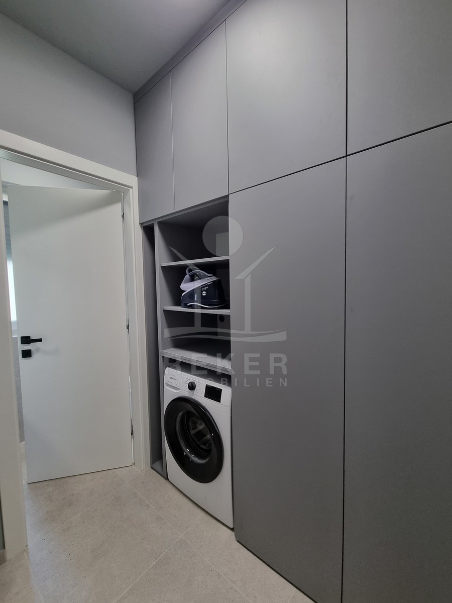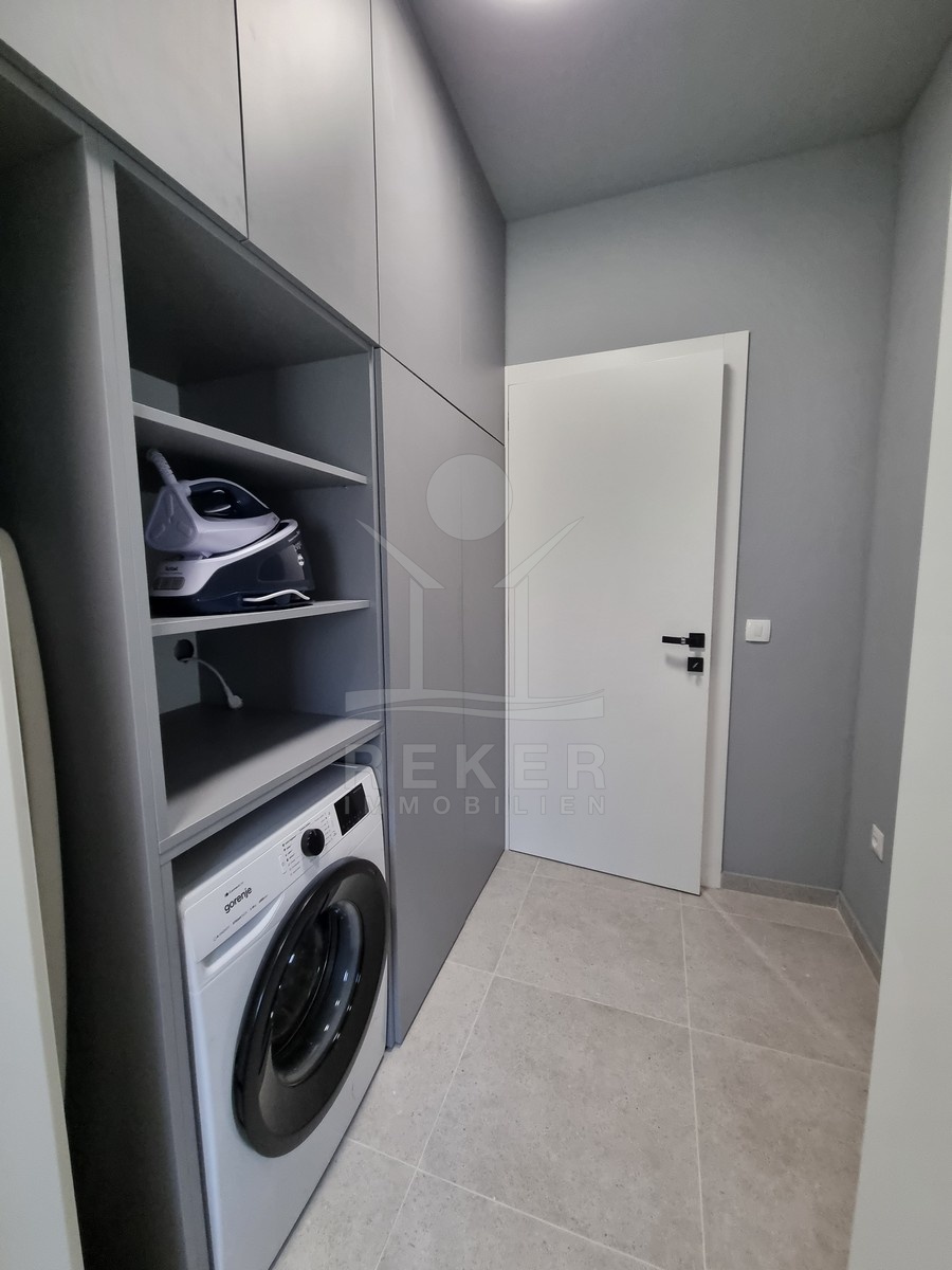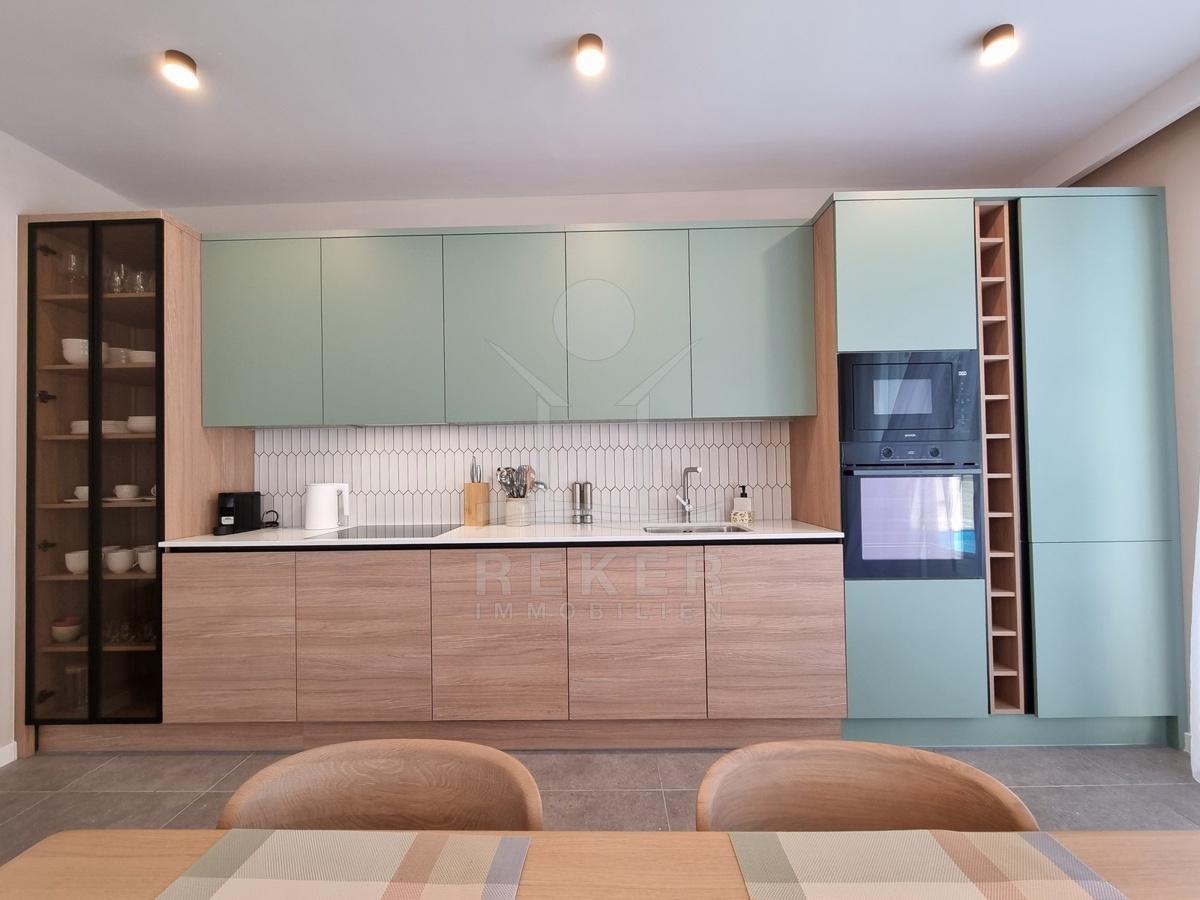 Unten spielt sich das Leben ab. Die offene Wohnküche ist über 37 m² groß – viel Platz für Sofa, Esstisch und Kochinsel. Direkt davor: die Terrasse und der Garten. Alles geht fließend ineinander über. Dazu gibt’s ein Schlafzimmer im Erdgeschoss, ein Bad, ein Gäste-WC, einen separaten Waschraum und Stauraum unter der Treppe. Alles klimatisiert, mit Fußbodenheizung und elektrischen Rollläden.