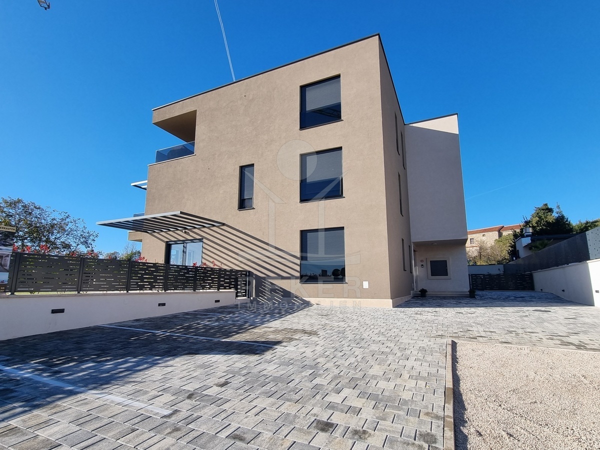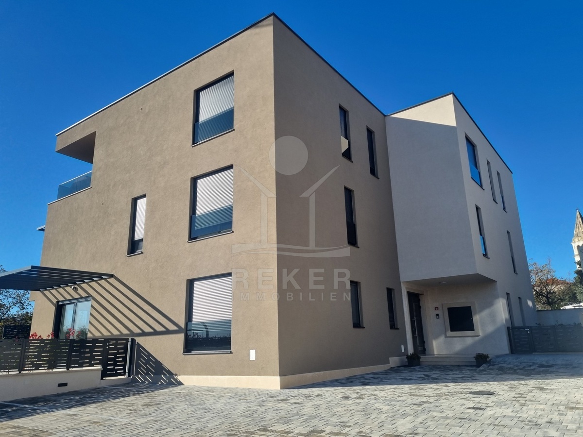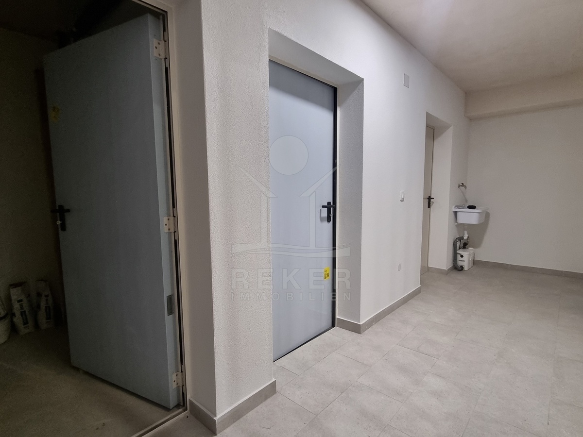 Das Haus hat drei Etagen und nur vier Wohneinheiten. Jede Wohnung ist zweigeschossig – Maisonette-Stil. Der Neubau stammt aus dem Jahr 2023. Kein Aufzug, aber ein helles, gepflegtes Treppenhaus mit Natursteinstufen. Alle Wohnungen haben einen eigenen Abstellraum im Untergeschoss. Dazu gehört je ein Stellplatz direkt vor dem Haus. Der Außenbereich ist sauber gepflastert, mit einem blickdichten Zaun eingefasst.