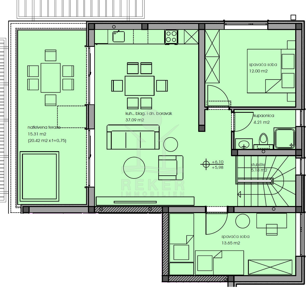 Diese Wohnung bietet das, was viele suchen – aber nur wenige finden: Platz auf zwei Ebenen, Privatsphäre und den Blick aufs Meer direkt vom Balkon aus. Die Maisonette beginnt im ersten Stock. Dort erwartet Sie ein geräumiger Eingangsbereich mit praktischem Garderobenraum, ein separates WC mit Waschmaschinenanschluss und ein Schlafzimmer mit eigenem Bad. Ein zweites Schlafzimmer liegt gleich nebenan. Die Innentreppe führt nach oben in den offenen Wohnbereich. Groß, hell, ruhig. Kochen, essen, entspannen – alles fließt ineinander. Und draußen: der überdachte Balkon mit freiem Meerblick. Hier lässt sich der Tag beginnen oder beenden. Wer möchte, kann sogar einen Whirlpool einbauen (Anschluss vorhanden).