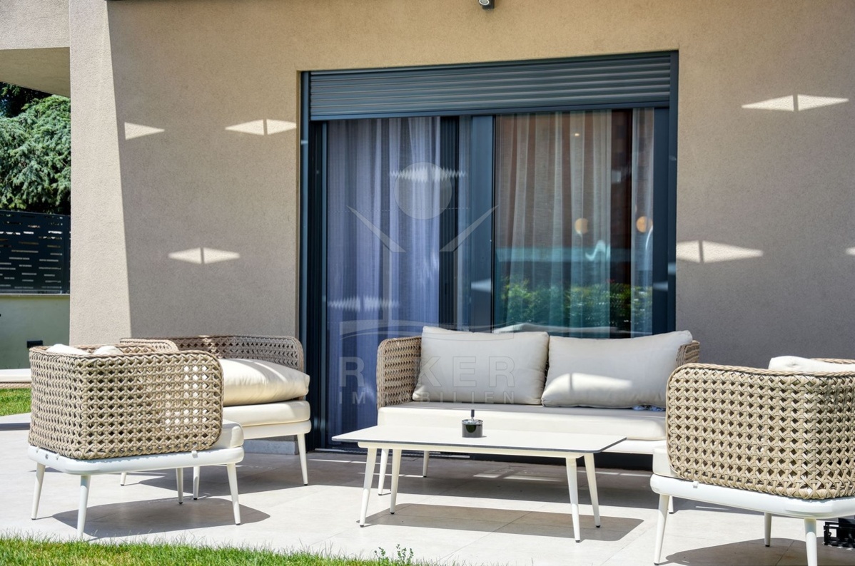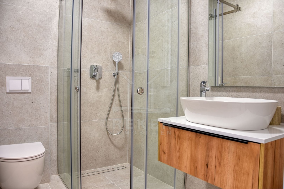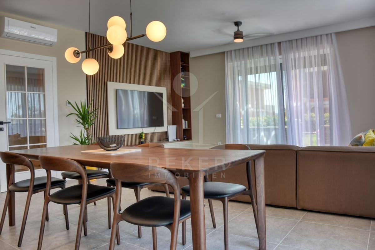 Im Erdgeschoss der klimatisierten Wohnung finden Sie ein 37 m² großes Wohnzimmer mit offener Küche und Essplatz, ein Schlafzimmer mit eigenem Bad, einen Technikraum, eine Garderobe und ein Gäste-WC.
