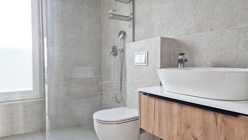 Im 1. Obergeschoss der klimatisierten Wohnung finden Sie ein Schlafzimmer mit eigenem Bad, ein Arbeitszimmer oder begehbaren Kleiderschrank, einen Flur und ein Gäste-WC.