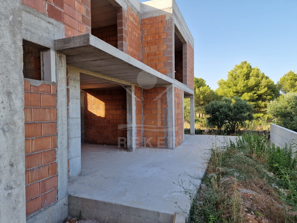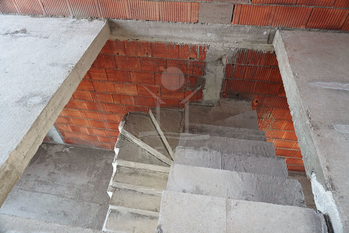 Die Außenwände stehen bereits und der Rohbau ist nahezu abgeschlossen. Das bedeutet, dass das Gebäude bereits seine endgültige Form hat, aber die Arbeiten im Inneren sind noch nicht abgeschlossen.