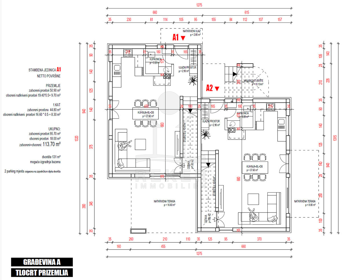Die zweistöckige Wohnung befindet sich in einem Gebäude mit 3 Wohneinheiten. Sie verfügt über einer Wohnfläche von 114 m² im Erdgeschoss und 1. Stock und bietet ein attraktives Grundstück mit der Möglichkeit, einen eigenen Pool im Innenhof zu bauen. Die Nordwestausrichtung garantiert eine angenehme Belichtung und Ausrichtung. Das Gebäude, Baujahr 2024, umfasst die Grundstücksfläche von 131 m² und wird mit modernen Elementen wie Aluminiumschreinerei, dreifachem Isolierglas und TI-Jalousien für optimalen Sonnenschutz ausgestattet. Das Haus bietet zudem Begrünung in den Innenhöfen und Rasenflächen sowie eine Vielzahl von praktischen Funktionen wie eingebaute Kamine, Fernbedienung zur Regelung von Heizung und Kühlung sowie eine elektrische Ladesteckdose für Autos. Darüber hinaus verfügt die Wohnung über zwei Parkplätze für bequeme Parkmöglichkeiten.