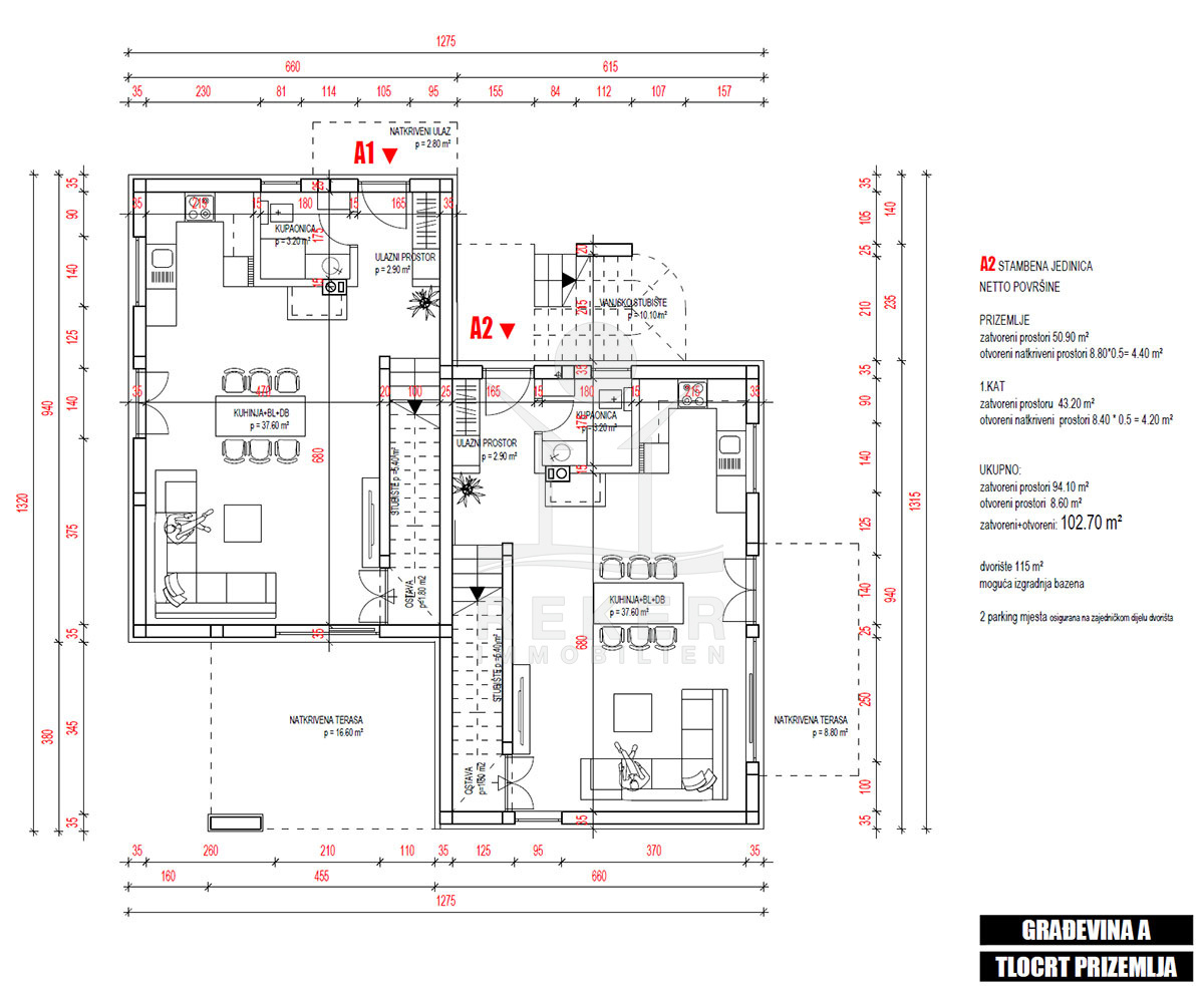 Das Apartment liegt auf einem 115 m² großen Grundstück mit einer Ausrichtung nach Südosten. Die Wohnung befindet sich in einem Neubau aus dem Jahr 2024 und bietet eine Wohnfläche von 103 m², die sich über Erdgeschoss und 1. Stock erstreckt. Das Gebäude verfügt über Aluminiumschreinereien mit unterbrochener Wärmebrücke und dreifachem Isolierglas für eine optimale Energieeffizienz. Mit einem eigenen Innenhof haben die Erdgeschosswohnungen sogar die Möglichkeit, einen Pool zu bauen. Moderne Ausstattungsmerkmale wie TI-Jalousien, eingebaute Kamine und Fernbedienungen für die Regelung von Heizung und Kühlung machen diese Maisonette zu einem komfortablen Zuhause. Darüber hinaus stehen 2 Stellplätze zur Verfügung, sodass für ausreichend Parkmöglichkeiten gesorgt ist.