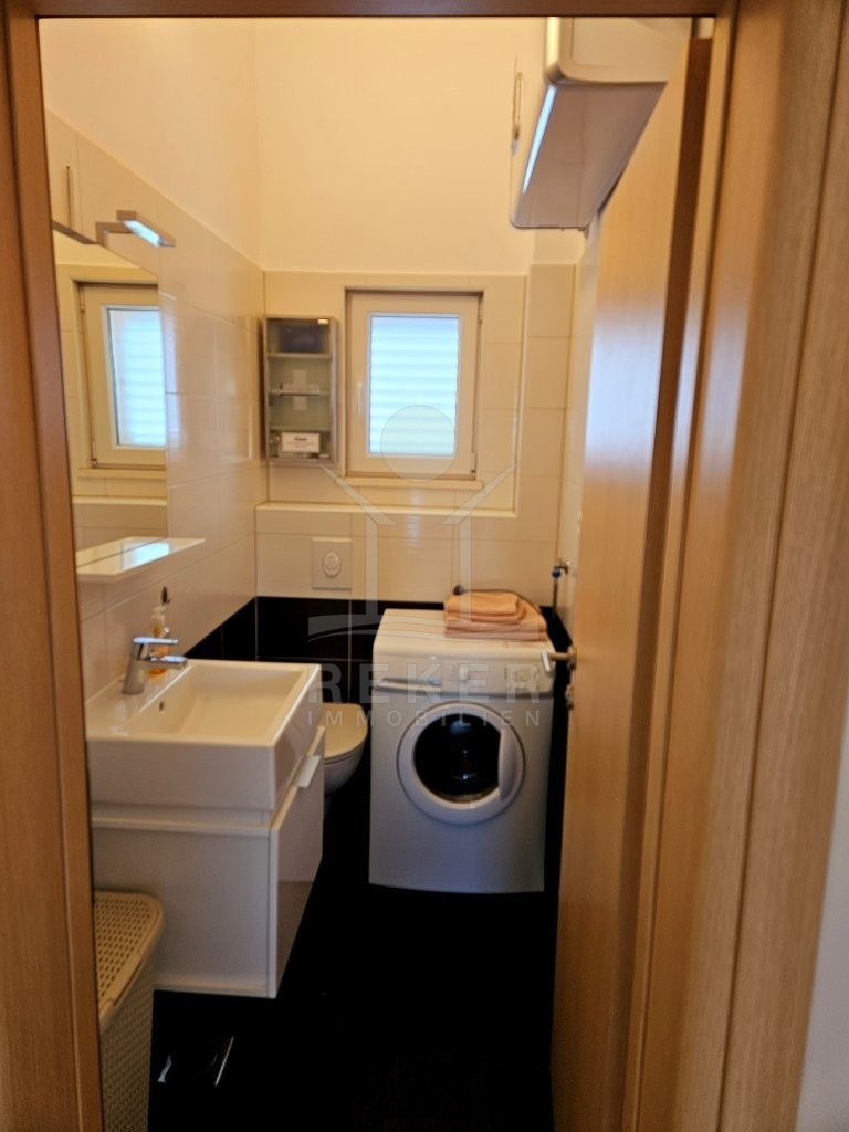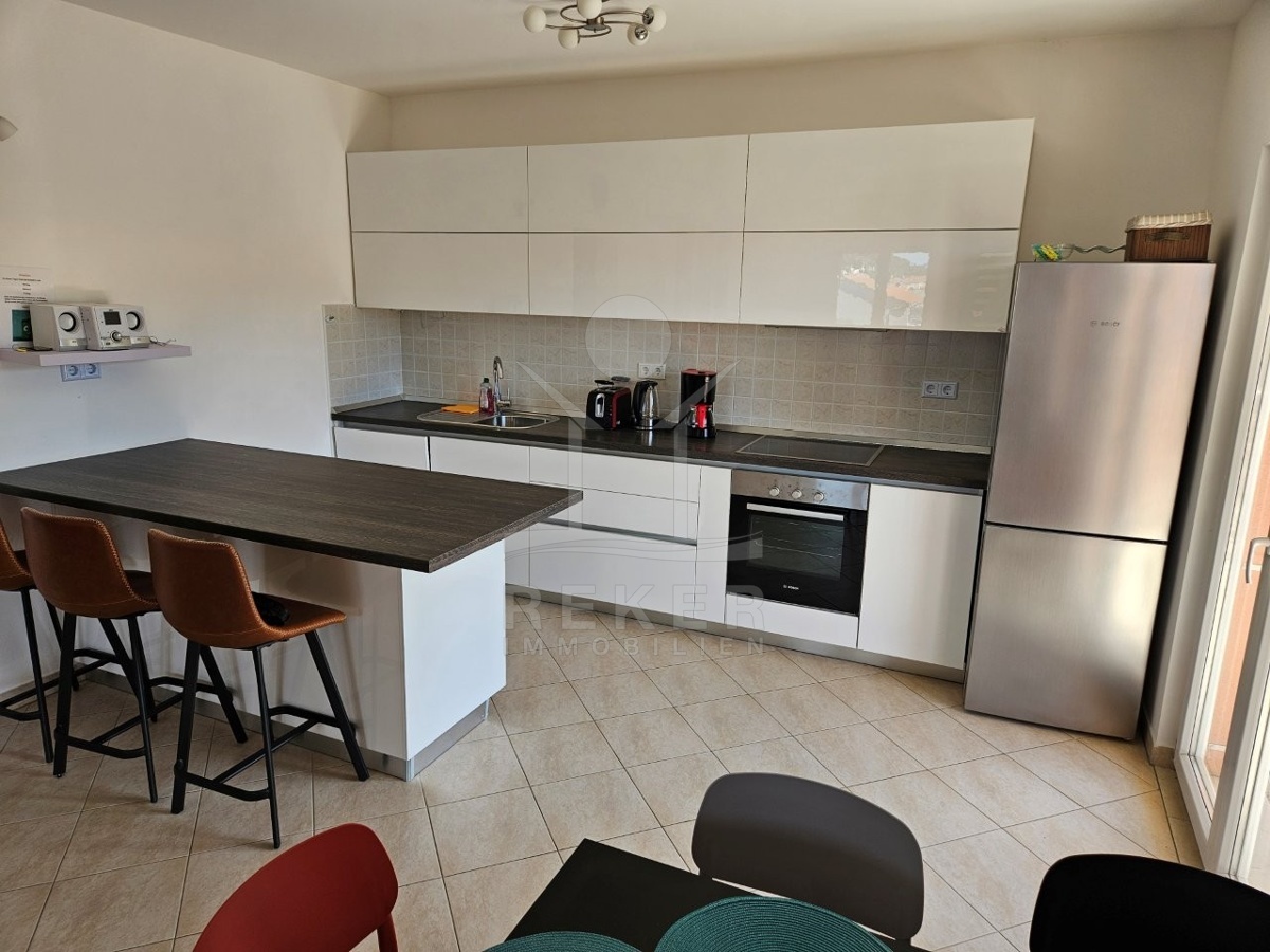 Draußen erwartet Sie ein angenehm gestalteter Hof mit Platz zum Parken. Auf der Rückseite gibt es einen kleinen Bereich mit Grill und Abstellraum – praktisch und gleichzeitig ein schöner Ort für gemütliche Abende. Jede Etage hat ihren eigenen Außenbereich: unten eine Terrasse mit Meerblick, oben zwei Balkone mit freier Sicht aufs Wasser. Alles gepflegt, alles bezugsbereit. Sie müssen sich um nichts kümmern.
