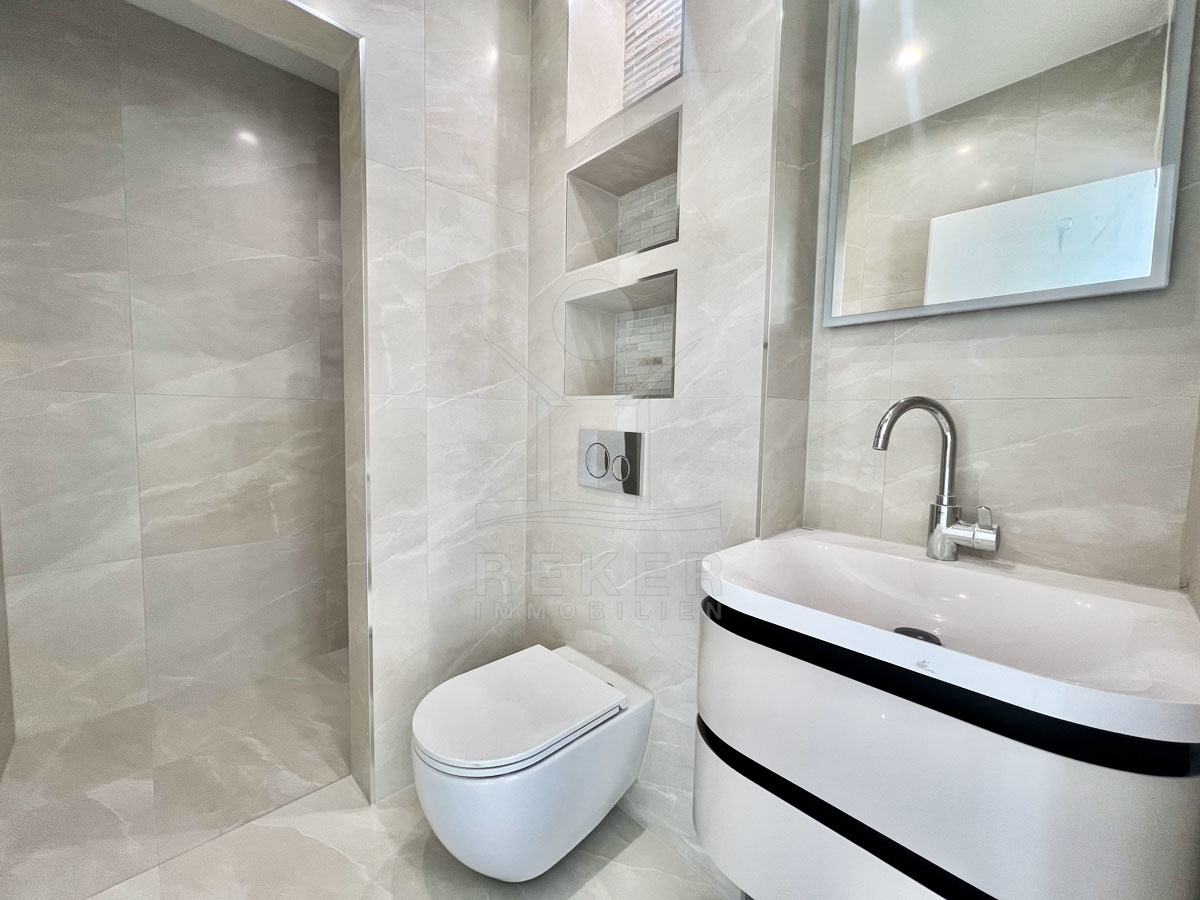 Das neugebaute Penthouse erstreckt sich über den 2. Stock eines dreistöckigen Gebäudes mit insgesamt drei Wohnungen aufgeteilt auf 2 Etagen. Die 70 m² große Wohnung verfügt über eine hochwertige Ausstattung, darunter Sicherheitstür, Video-Gegensprechanlage, Fußbodenheizung, Klimaanlage, elektrische Jalousien und Moskitonetze. Der Neubau aus dem Jahr 2024 bietet modernen Wohnkomfort und ist bezugsfertig. Ein Parkplatz auf dem Grundstück sorgt für bequemes Parken.
