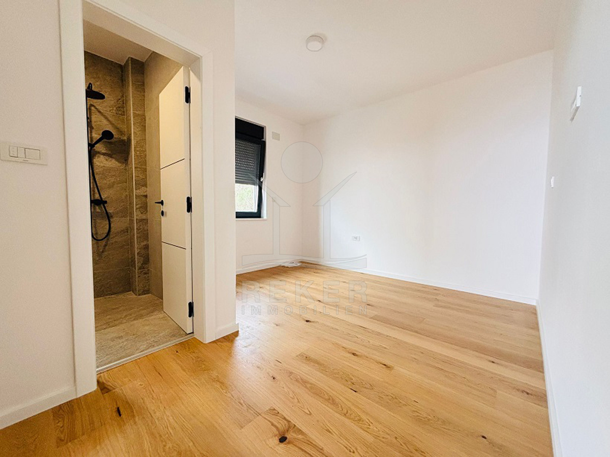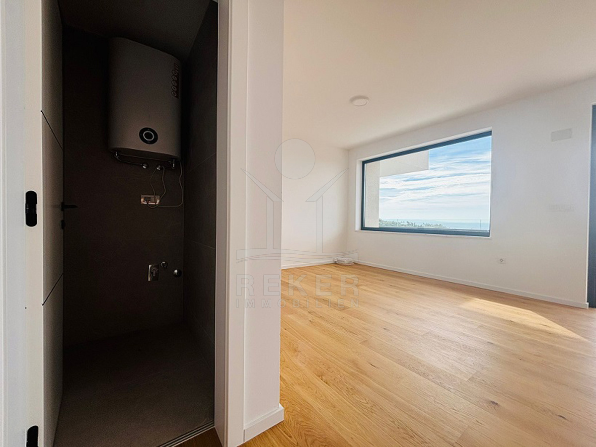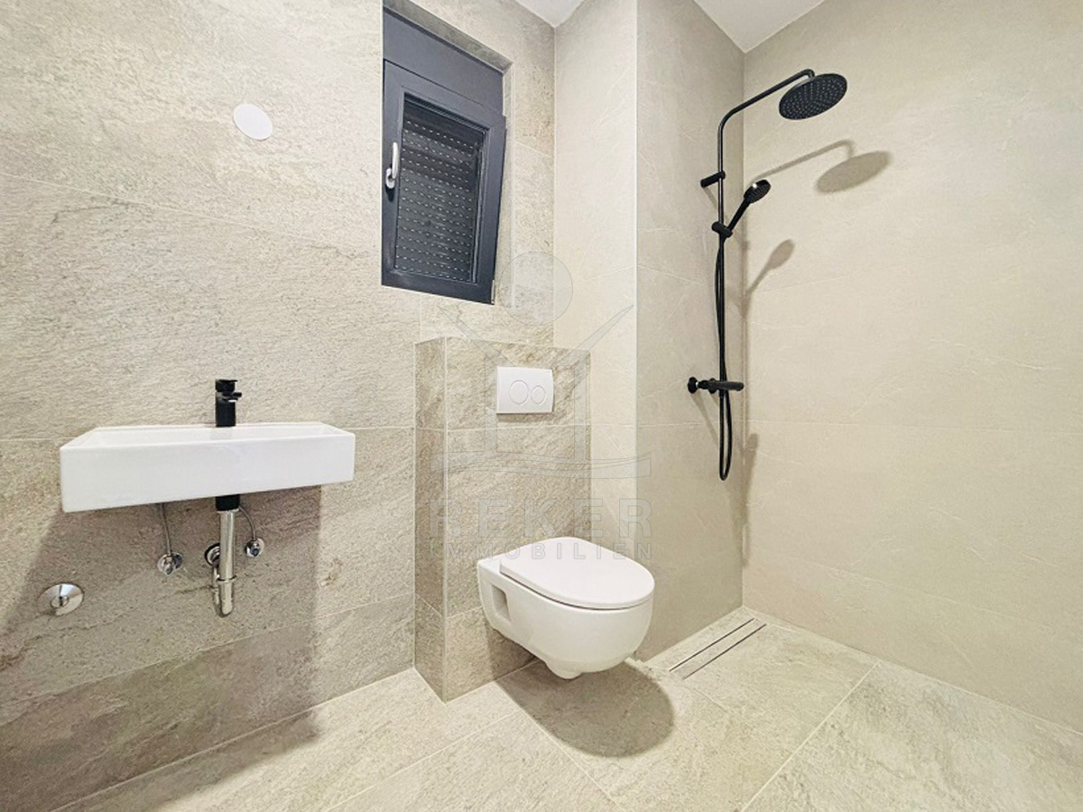 Das Haus ist frisch fertiggestellt und umfasst nur fünf Wohnungen auf drei Etagen. Die Architektur setzt auf klare Linien und moderne Formen: warme Naturtöne, Flachdach, großzügige Terrassen. Vor dem Eingang gibt es markierte Parkplätze. Auf der Rückseite wurde das Grundstück terrassiert und gestaltet mit jungen Bäumen, mediterranen Sträuchern und hellen Steinen. Dank der Hanglage genießen Sie schöne Ausblicke und viel Tageslicht. Der Zugang erfolgt bequem über das zentrale Treppenhaus. Alles ist neu, unbewohnt und bereit für den Erstbezug 2025.