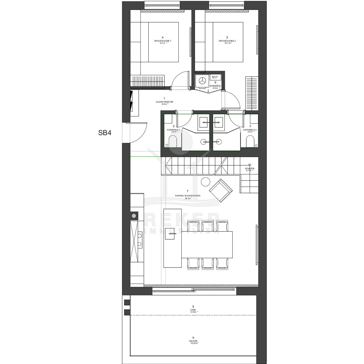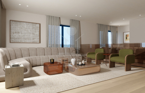 Dieses elegante Penthouse über zwei Etagen begeistert mit Großzügigkeit, moderner Technik und einem beeindruckenden Blick auf das Meer. Auf 122,70 m² Innenfläche empfängt Sie im 1. Obergeschoss ein weiter Wohnbereich mit offener Küche (34,10 m²). Hier lässt sich entspannen, kochen und das Leben genießen. Zwei Schlafzimmer, zwei Badezimmer sowie praktische Nebenräume wie Abstellflächen und ein Eingangsbereich sorgen für angenehmen Komfort. Eine Loggia (5,10 m²) und ein Balkon (10,49 m²) erweitern den Wohnraum nach draußen und schaffen fließende Übergänge zwischen Innen und Außen.