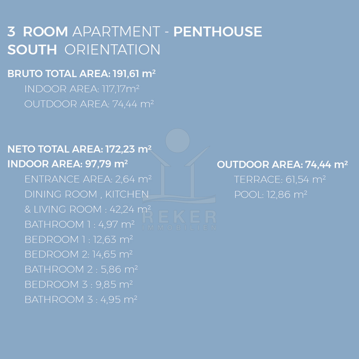 Die beeindruckende Penthousewohnung erstreckt sich über großzügige 172 m² und bietet eine großartige Raumaufteilung. Sie ist mit einer Klimaanlage ausgestattet, die für ein angenehmes Wohnklima sorgt. Genießen Sie die lichtdurchfluteten Räume und die einzigartige Panoramaaussicht, die jeden Tag zu einem Erlebnis macht. Der offene Wohnbereich verbindet das Ess- und Küchenzimmer und lädt zum geselligen Beisammensein ein. Mit 3 Schlafzimmern und 2 Badezimmern haben Sie ausreichend Platz für Familie und Gäste. Der zugängliche Pool und der Terrassenbereich erweitern Ihr Wohngefühl und bietet perfekten Ort, die schönste Zeit des Jahres zu genießen!