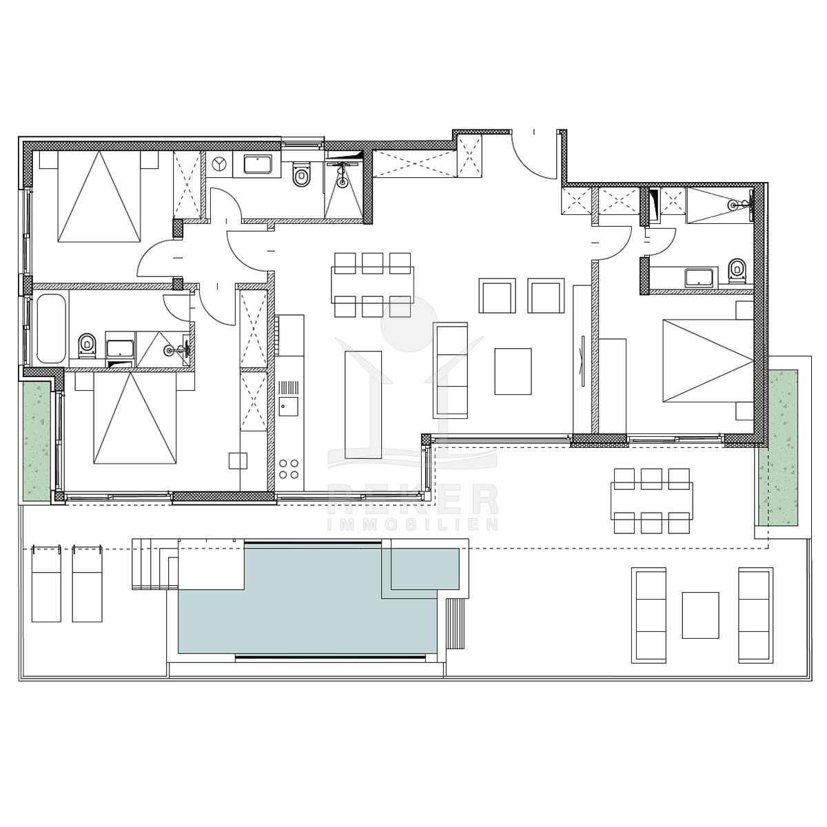 Zusätzlich stehen den Bewohnern eine gemeinschaftliche Terrasse mit Pool sowie ein Wellnessbereich mit Sauna und Fitnessraum zur Verfügung. Ein Rundumpaket für gehobenes Wohnen und puren Genuss!
