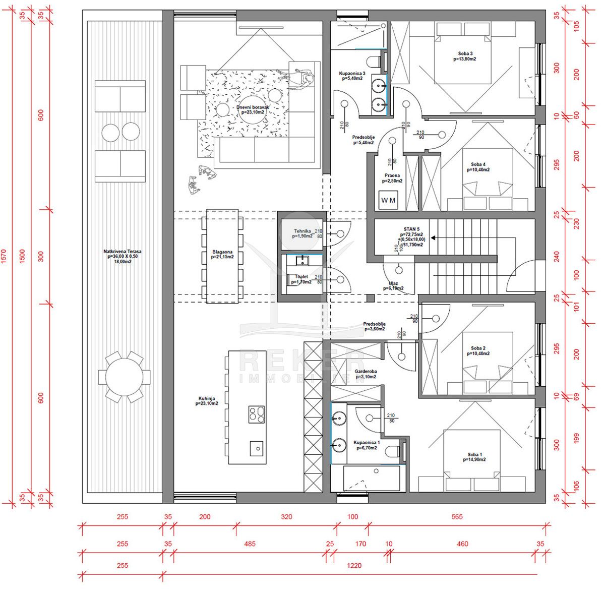 Die geräumige Immobile verfügt über eine Klimaanlage und Fußbodenheizung für angenehmen Komfort. Das Highlight dieser Wohnung ist die außergewöhnlich intelligente und funktionale Raumaufteilung. Das großzügige Wohnzimmer, die Küche und der Essbereich bilden eine Einheit mit insgesamt 67 m². Hier können Sie Ihre Gäste empfangen und gemeinsame Mahlzeiten genießen. Das Penthouse wird über vier Schlafzimmer verfügen, von denen jedes individuelle Rückzugsorte bietet. Zwei Badezimmer stehen zur Verfügung, sodass auch der Familienalltag reibungslos funktionieren kann. Darüber hinaus gibt es ein Gäste-WC, einen Waschraum, einen Heiz- und Technikraum sowie einen Abstellraum von 4 m².