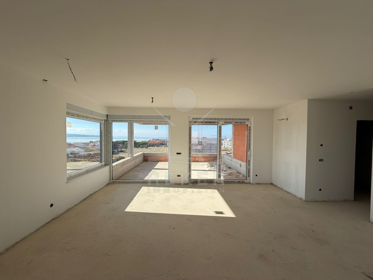 Das Gebäude umfasst vier Wohnungen auf drei Ebenen. Im Erdgeschoss und im ersten Stock entstehen zwei identische Einheiten. Darüber befindet sich das Penthouse mit großzügigem Blick auf das Meer. Eine weitere Wohnung erstreckt sich über zwei Etagen, unten mit Wohnbereich, oben mit Schlafzimmern. Jede Einheit bietet eine eigene Terrasse oder einen Balkon, perfekt, um die Umgebung auf sich wirken zu lassen. Die Architektur überzeugt mit klarer, moderner Formensprache und einem Fokus auf Raumgefühl und Aussicht. Für jede Wohnung steht ein eigener Parkplatz direkt vor dem Haus zur Verfügung.