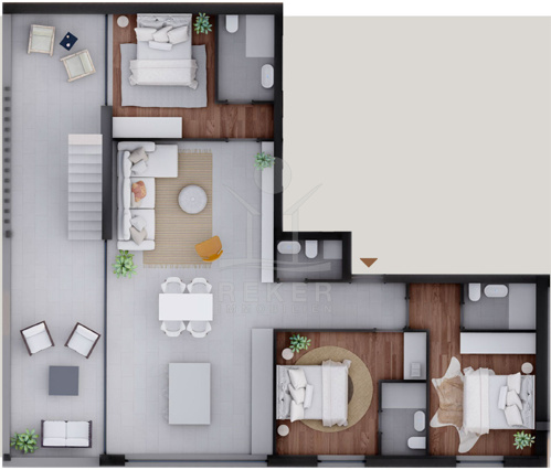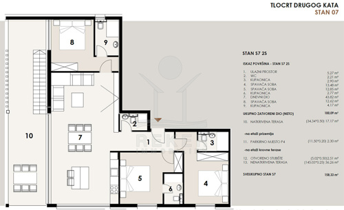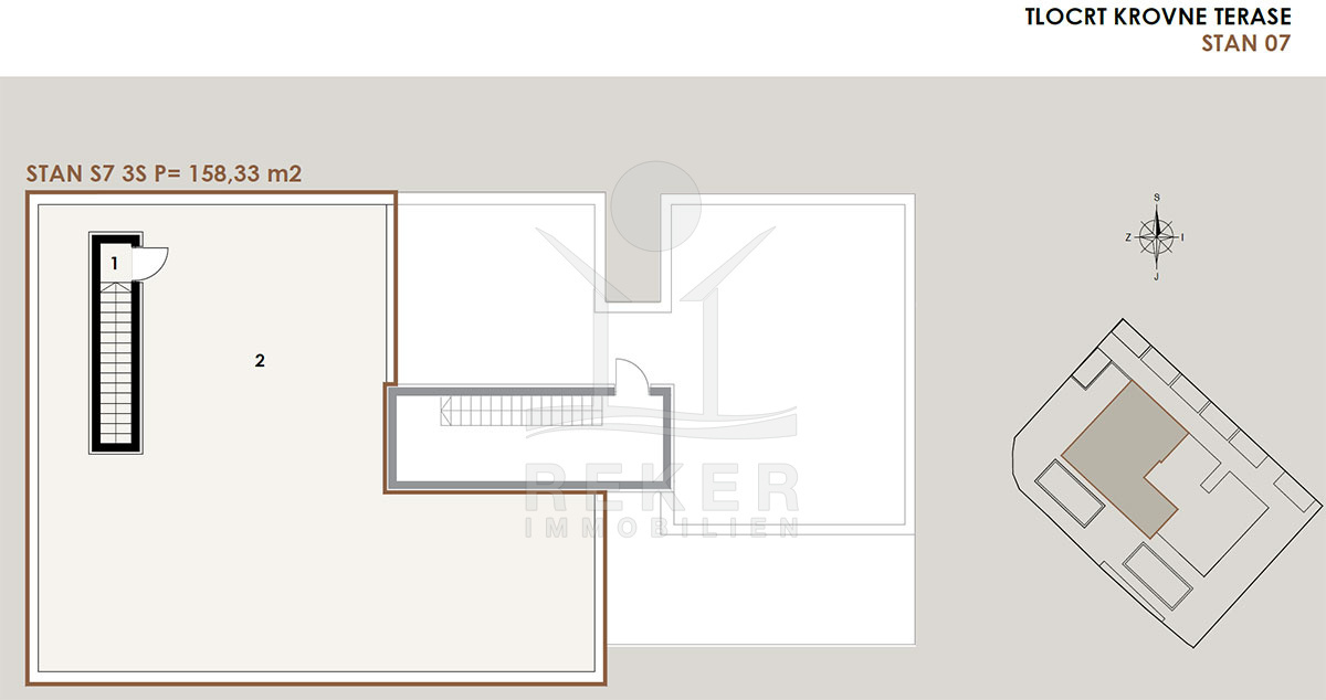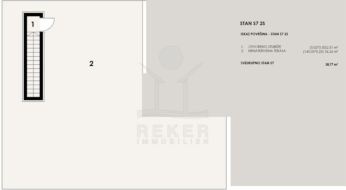Die Terrasse auf Wohnebene umfasst 34,34 m². Sie öffnet den Weg zum 145,03 m² großen Dachbereich. Über eine private Treppe gelangen Sie direkt zur Dachterrasse, einem Ort der Ruhe mit weitem Blick auf das Meer. Der Bereich eignet sich für entspannte Stunden, gemeinsame Abende oder Momente, in denen Sie den Sonnenuntergang über der Adria genießen.