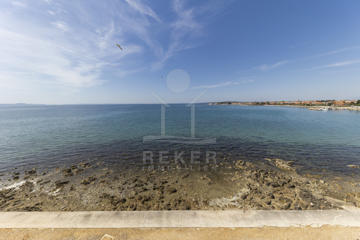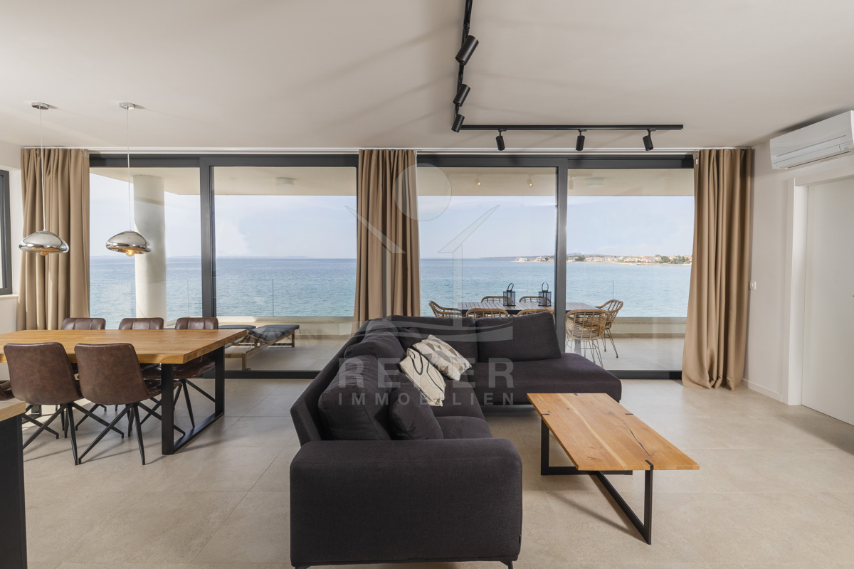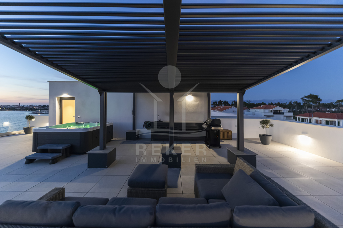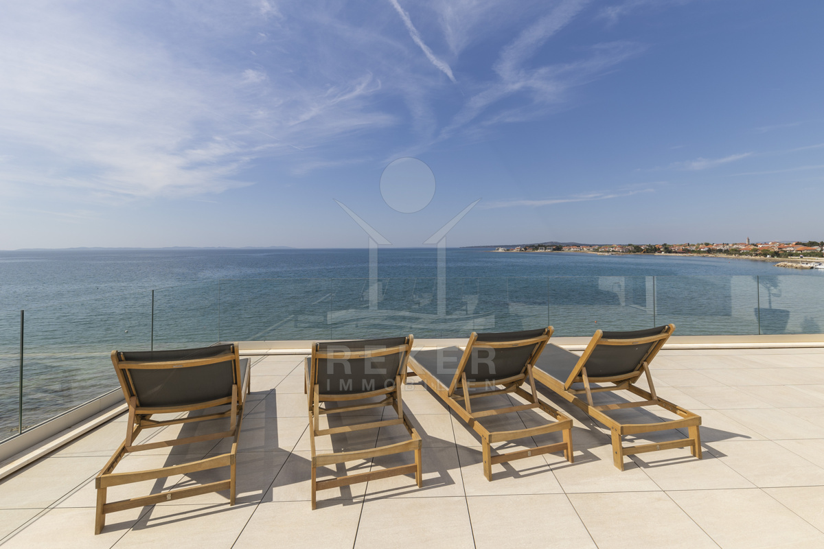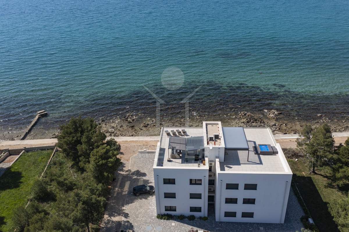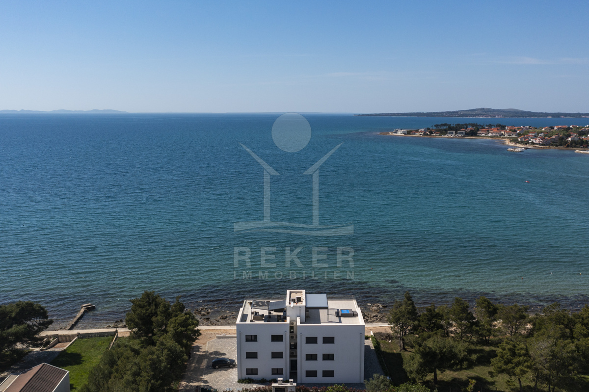 Nur fünf Meter vom Meer entfernt befindet sich dieses exklusive Penthouse in erster Reihe von Privlaka, einem der schönsten Küstenorte Norddalmatiens. Das moderne Gebäude steht direkt an der Uferpromenade, in ruhiger Umgebung, und verfügt über einen privaten Stellplatz (14,19 m²). Hier verbinden sich Meeresnähe und Wohnkomfort auf besondere Weise.