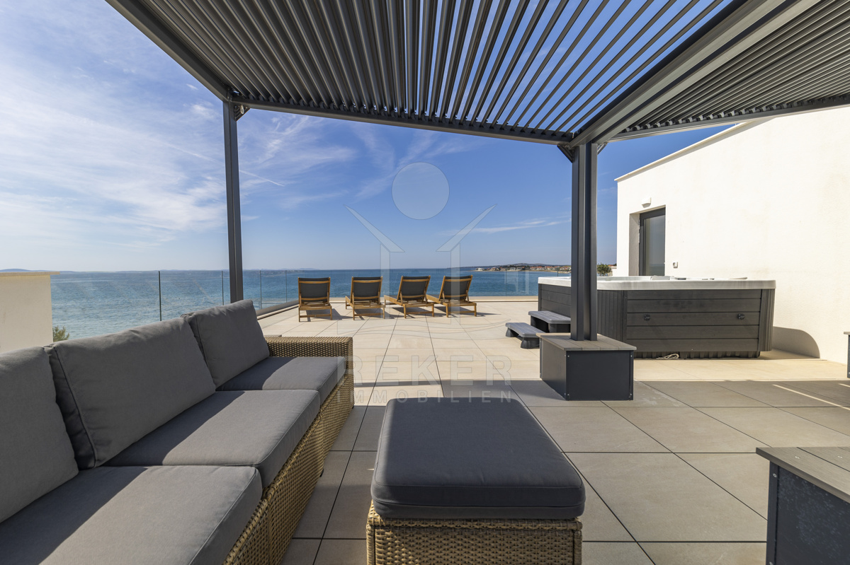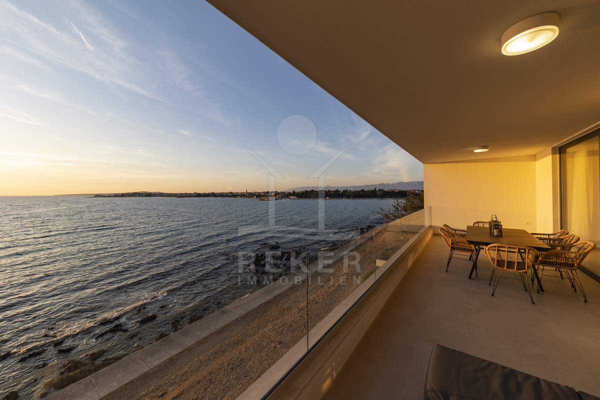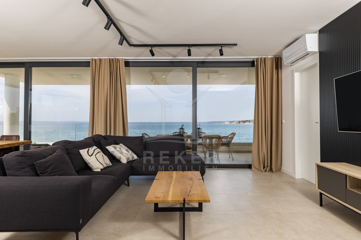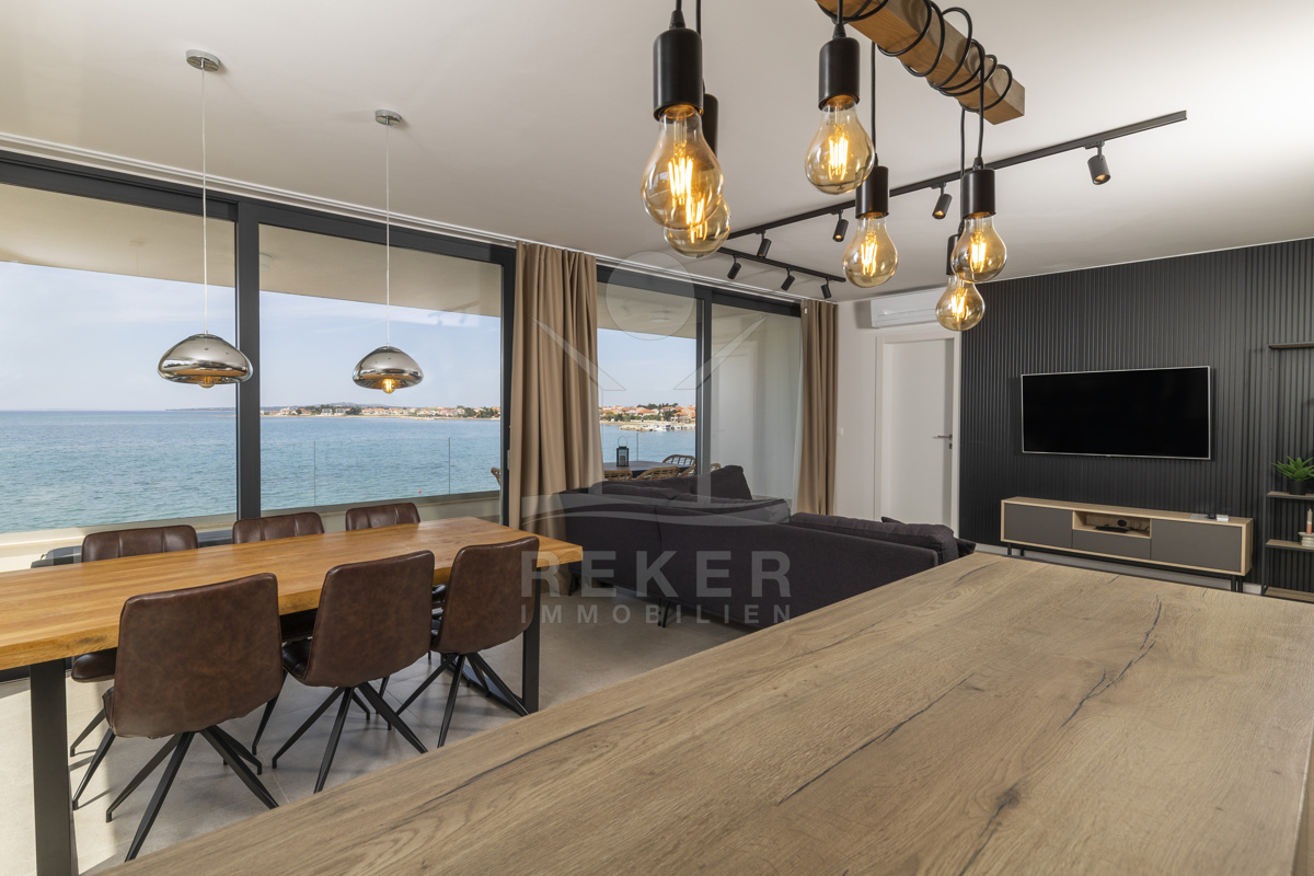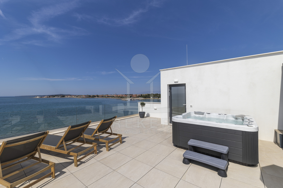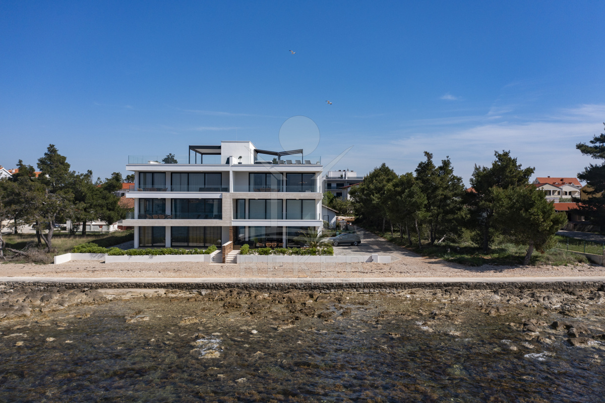 Nur fünf Meter vom Meer entfernt befindet sich dieses exklusive Penthouse in erster Reihe von Privlaka, einem der schönsten Küstenorte Norddalmatiens. Das moderne Gebäude steht direkt an der Uferpromenade, in ruhiger Umgebung, und verfügt über einen privaten Stellplatz (14,19 m²). Hier verbinden sich Meeresnähe und Wohnkomfort auf besondere Weise.
