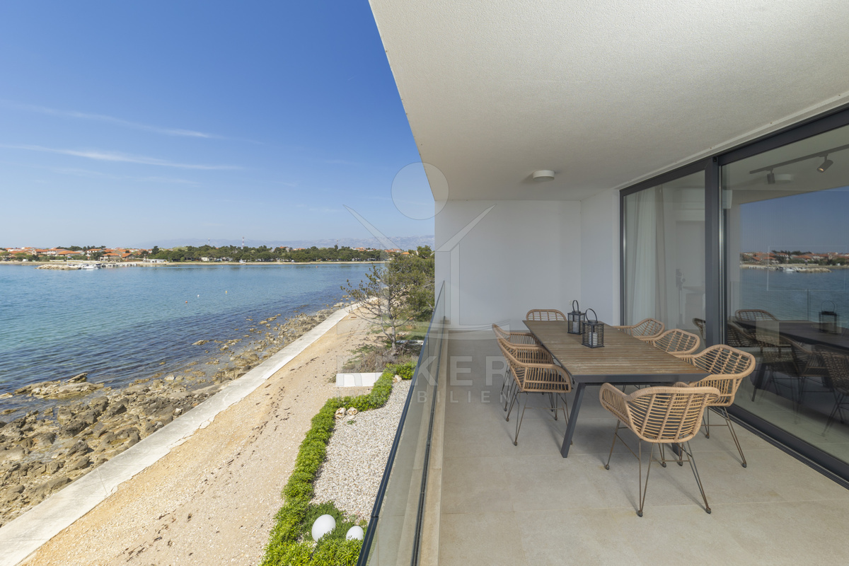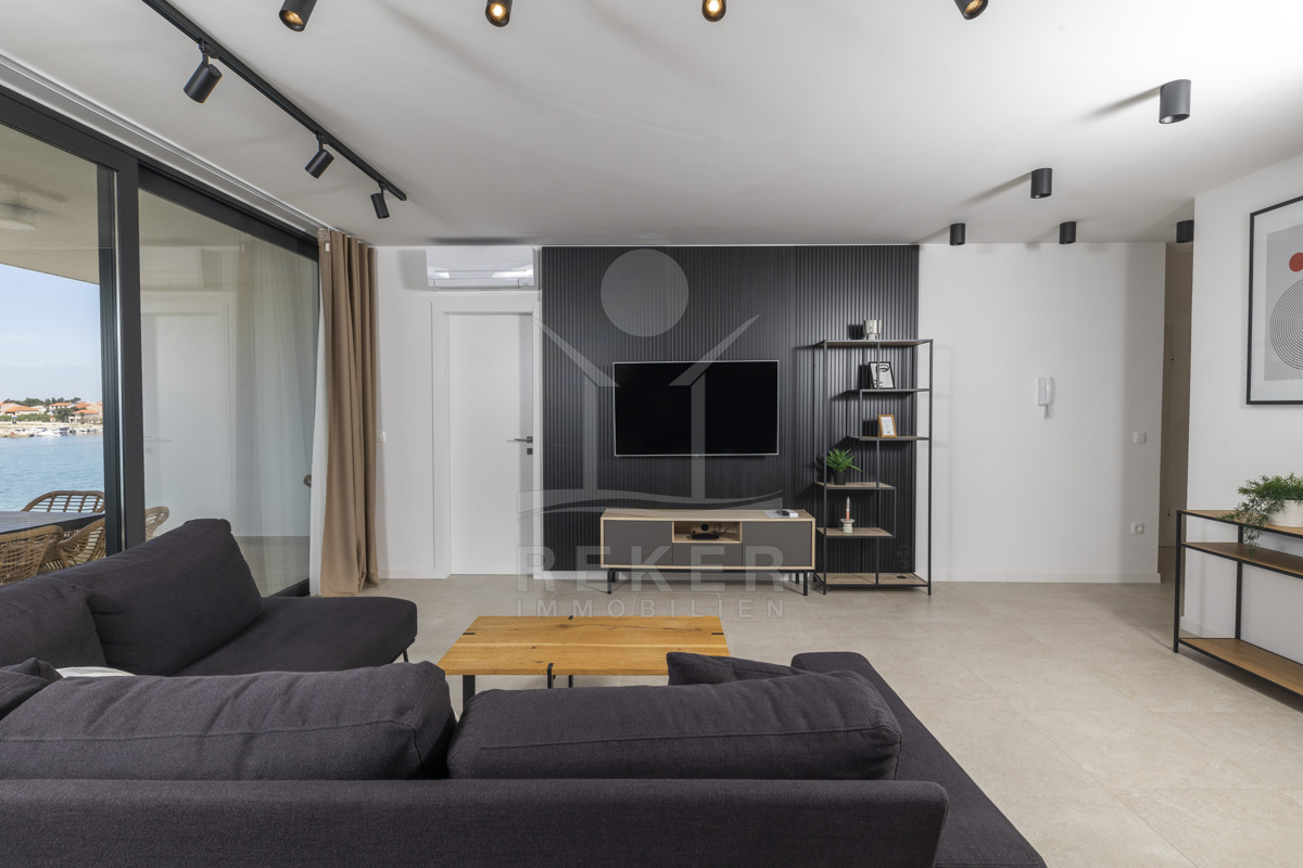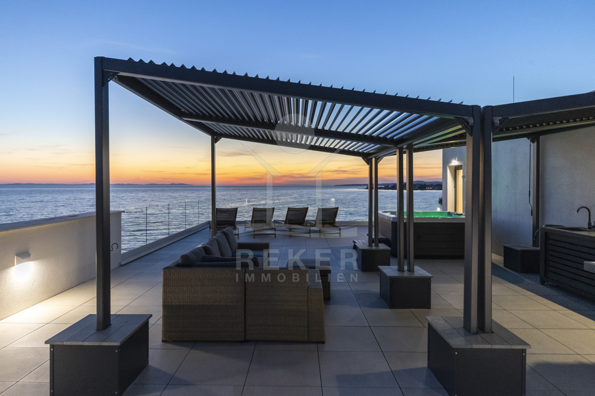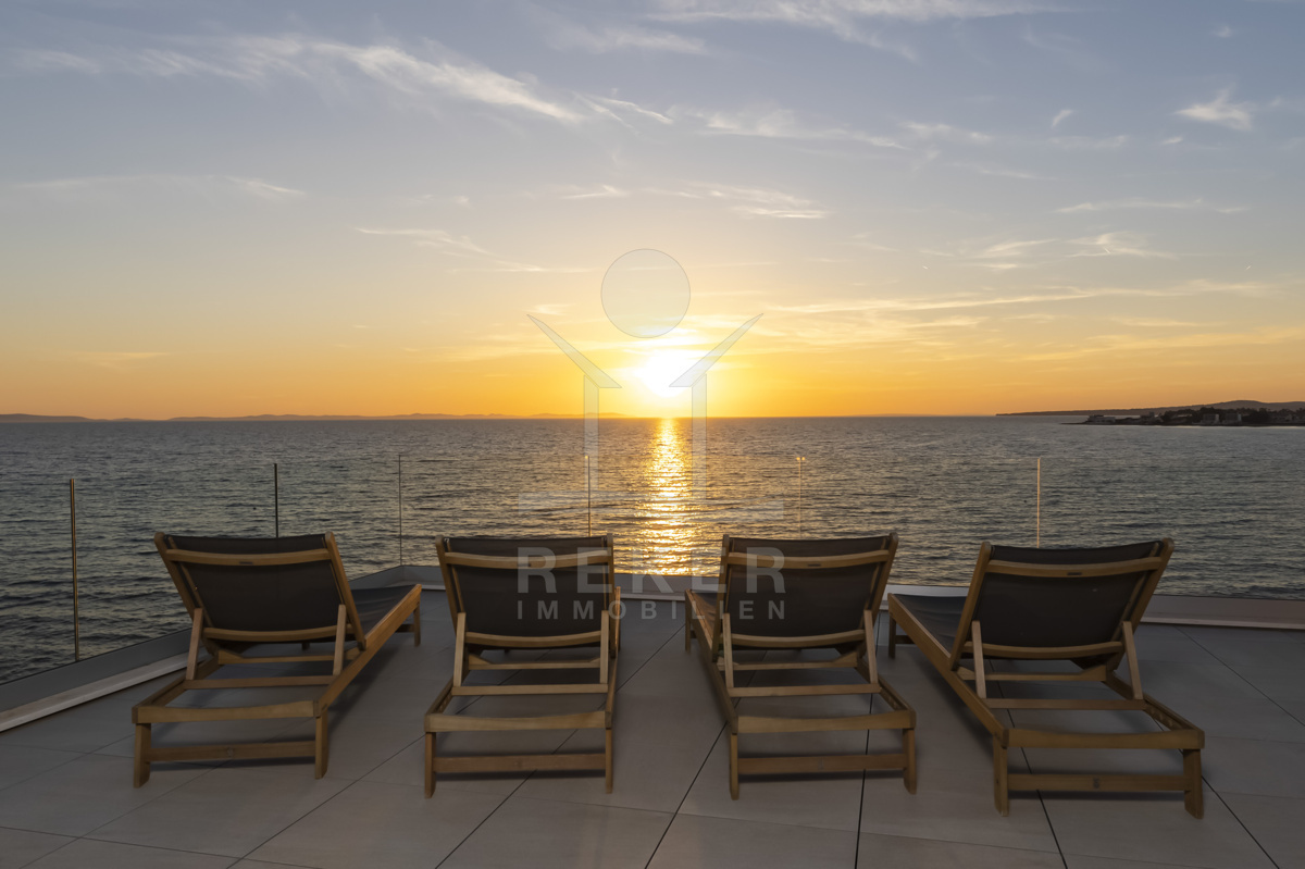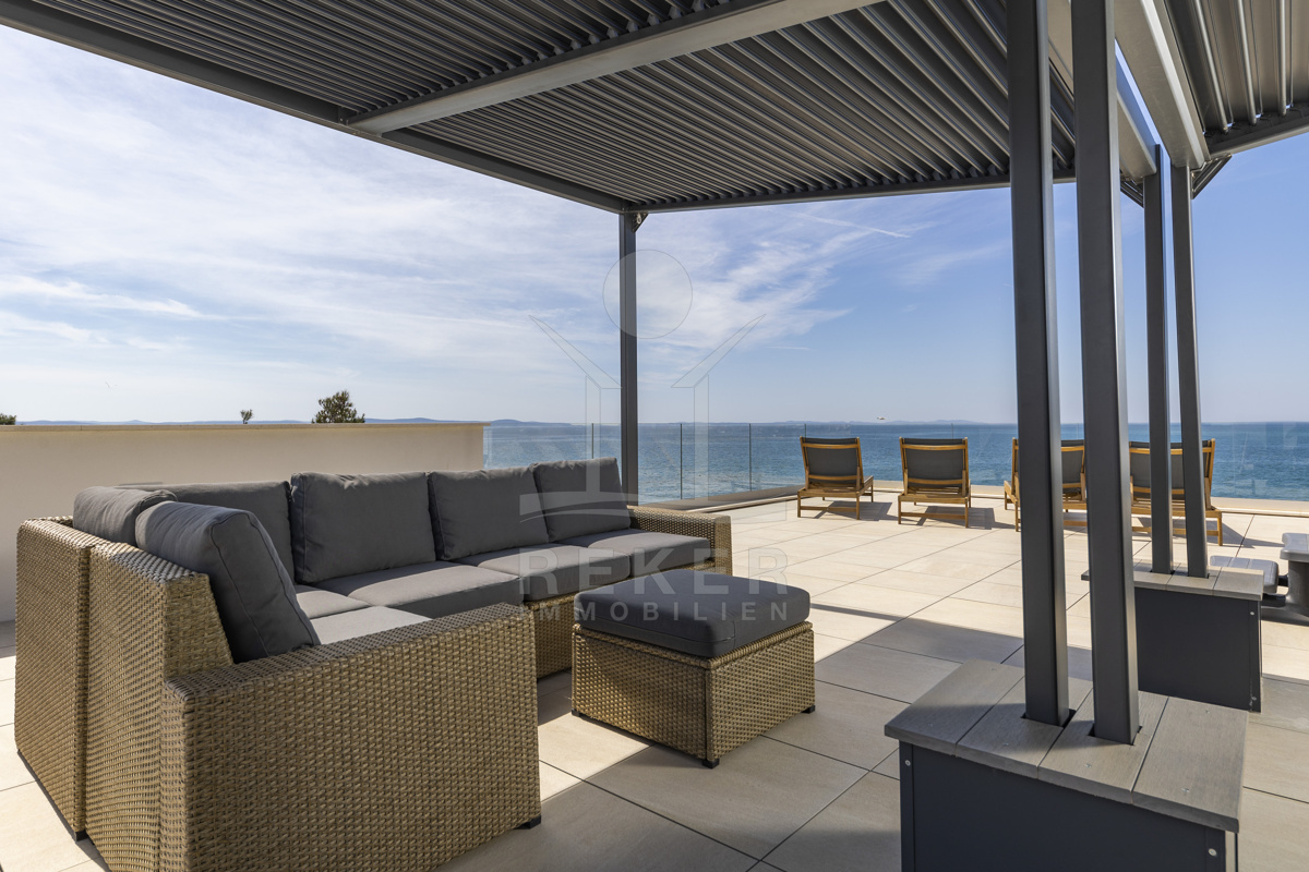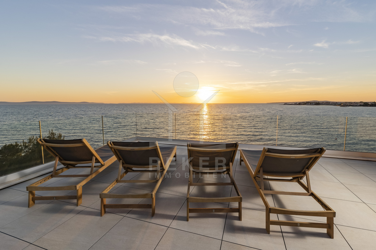 Nur fünf Meter vom Meer entfernt befindet sich dieses exklusive Penthouse in erster Reihe von Privlaka, einem der schönsten Küstenorte Norddalmatiens. Das moderne Gebäude steht direkt an der Uferpromenade, in ruhiger Umgebung, und verfügt über einen privaten Stellplatz (14,19 m²). Hier verbinden sich Meeresnähe und Wohnkomfort auf besondere Weise.