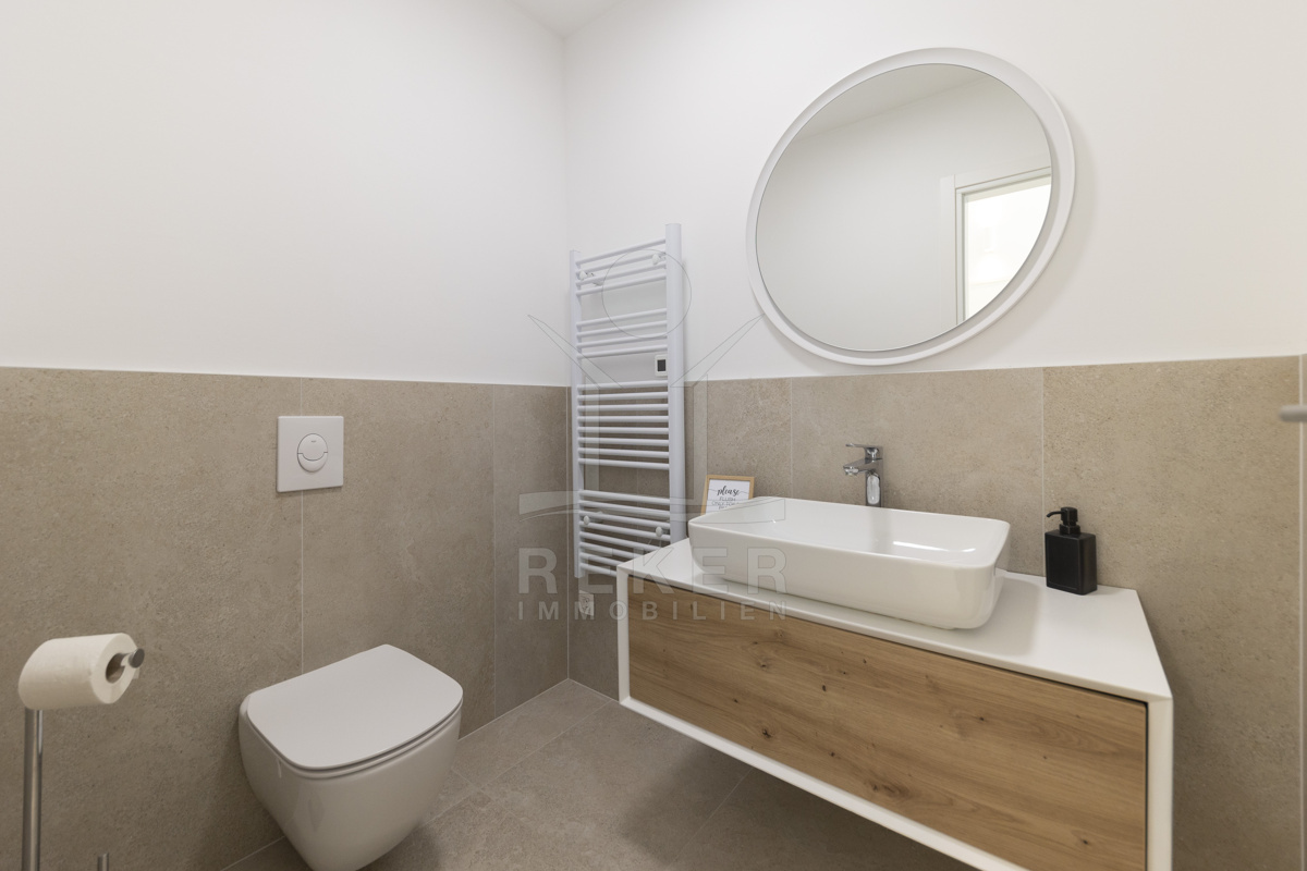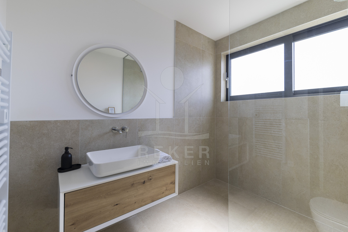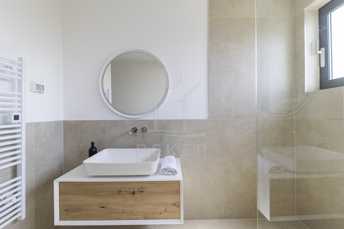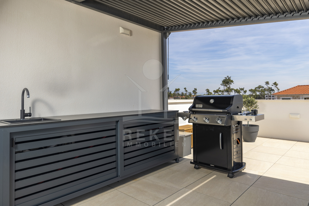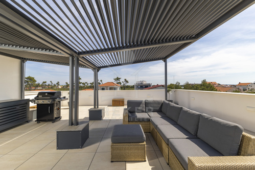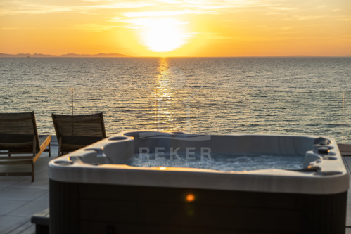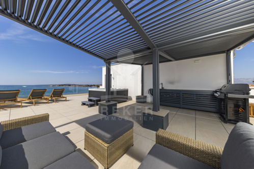 Eine private Treppe führt auf die großzügige Dachterrasse mit 116,51 m² Nutzfläche. Sie bildet das Herzstück dieser Immobilie, ausgestattet mit Lounge, Sommerküche, Grill, Liegestühlen und Whirlpool. Hier genießen Sie Privatsphäre und ein beeindruckendes Panorama über Meer und Küstenlandschaft. Ein Zuhause, das Meer, Stil und Ruhe vereint, und jeden Tag zu einem besonderen Erlebnis macht.