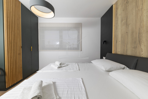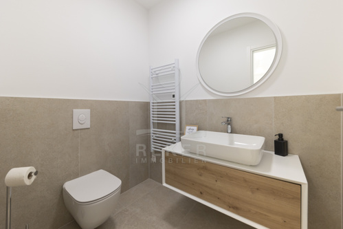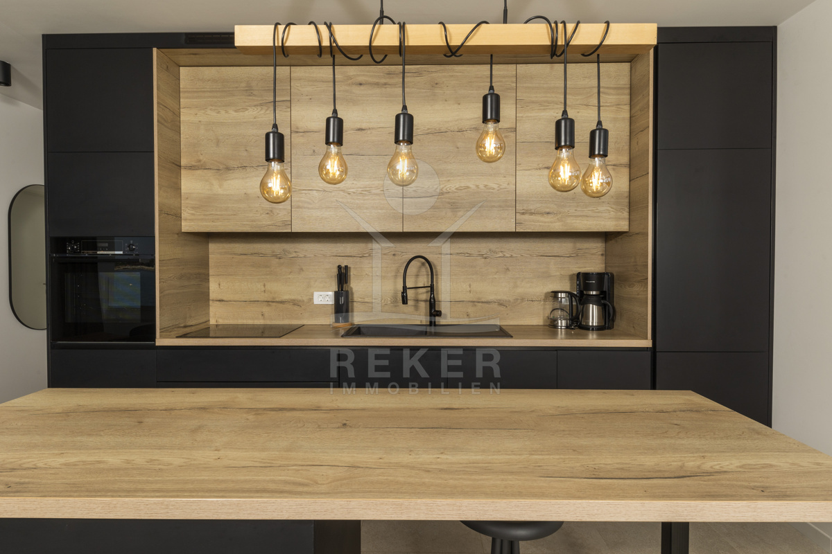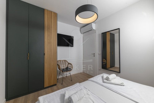 Das Penthouse befindet sich im zweiten Obergeschoss und bietet 95,82 m² Innenfläche. Ein heller Eingangsbereich führt in den großzügigen Wohn- und Essraum mit offener Küche. Große Panoramafenster öffnen den Blick Richtung Westen auf das Meer. Die Küche ist hochwertig ausgestattet, mit moderner Einbauküche, Kochinsel und Essbereich im Holz-Schwarz-Design. Zwei Schlafzimmer, ein Badezimmer, ein separates WC und ein Abstellraum mit Waschküche sorgen für hohen Wohnkomfort. Die luxuriöse Einrichtung ist im Kaufpreis enthalten. Von der überdachten Terrasse mit 28,27 m² genießen Sie den Sonnenuntergang über dem Meer.