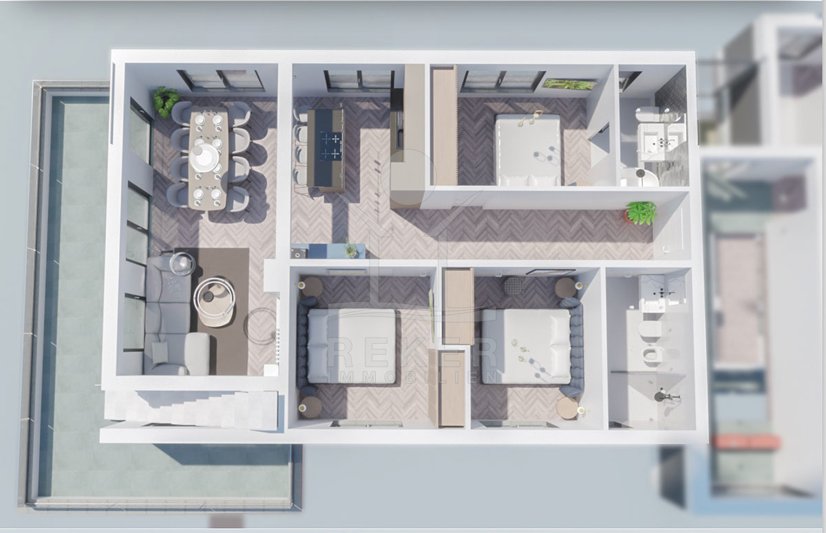 Die großzügige 120 m² Wohnung besticht durch ihre wunderschönen Parkettböden und erstklassigen Fliesen. Die Klimaanlage mit Konverter sorgt für angenehme Raumtemperaturen. Die Wohnung verfügt über eine Küche, Esszimmer, Wohnzimmer, zwei Badezimmer, drei Schlafzimmer, einen Balkon und eine große Dachterrasse über der Wohnung. Hier können Sie luxuriös und bequem wohnen und den Komfort eines großzügigen Wohnraums genießen.