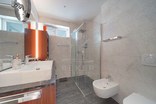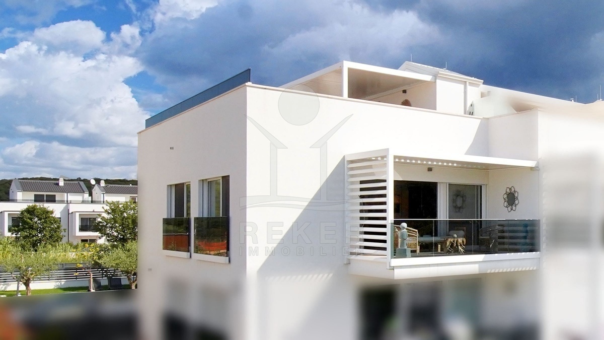 In Rovinj, in einem ruhigen Stadtteil und nur 280 m vom Strand entfernt, befindet sich dieses moderne Penthouse in einem hochwertigen Wohngebäude aus dem Jahr 2021. Das Haus umfasst nur sechs Wohnungen. Ein Aufzug und eine Tiefgarage stehen zur Verfügung. Die energieeffiziente Bauweise ist mit Energieausweis A+ bestätigt. Zwei Stellplätze im Untergeschoss sind im Kaufpreis enthalten. Sie parken bequem und geschützt direkt am Haus.