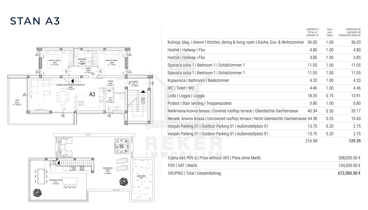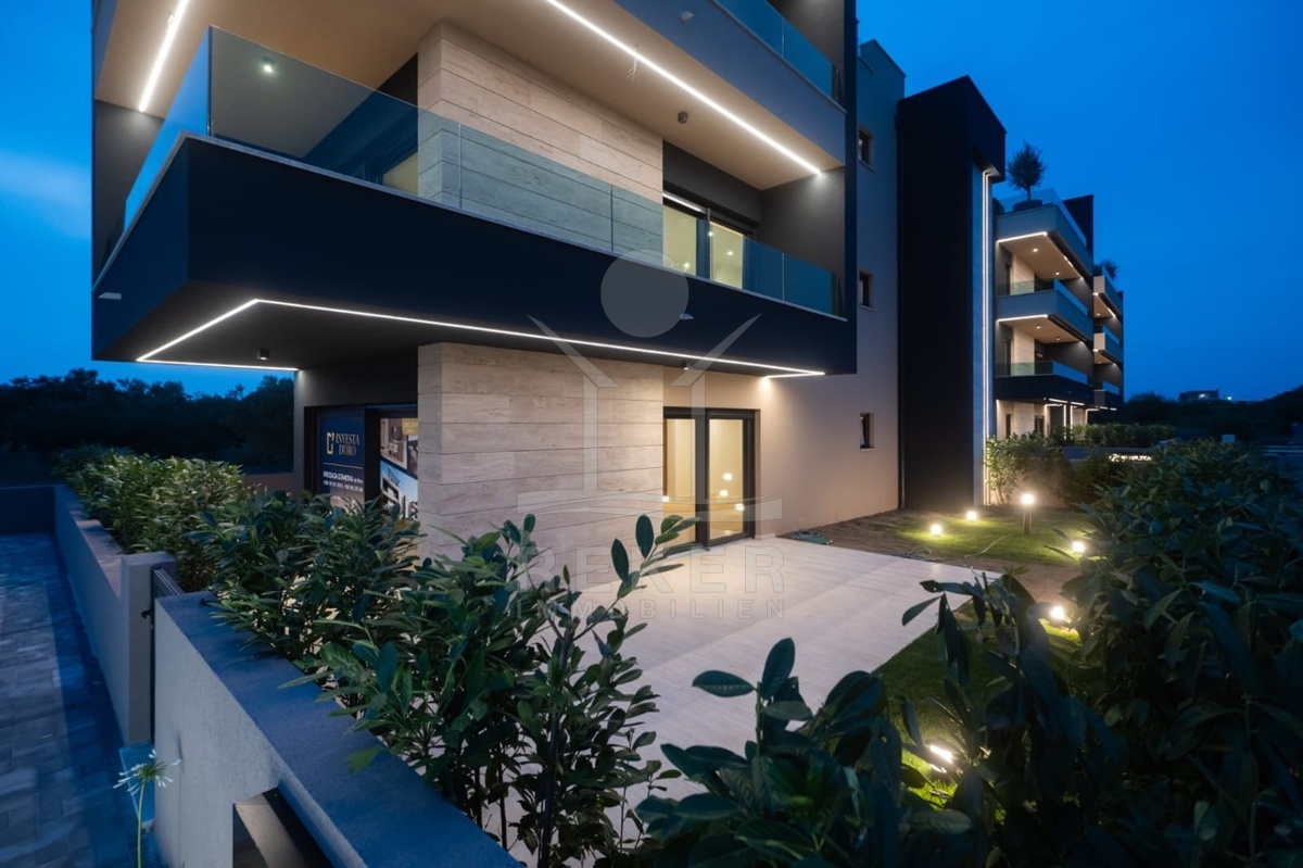 Das Penthouse erstreckt sich über die gesamte oberste Etage und bietet einen freien Blick über den Zadarer Archipel. Der großzügige Wohn- und Essbereich mit integrierter Küche misst 36 m² und öffnet sich über bodentiefe Glasflächen zur südlich ausgerichteten Loggia. Licht, Weite und Offenheit bestimmen die Atmosphäre. Zwei gleich große Schlafzimmer bieten Räume der Ruhe. Das Badezimmer mit großformatigem Feinsteinzeug und DEVI-Fußbodenheizung sorgt für Komfort und Stil. Ein separates Gäste-WC ergänzt den Grundriss.