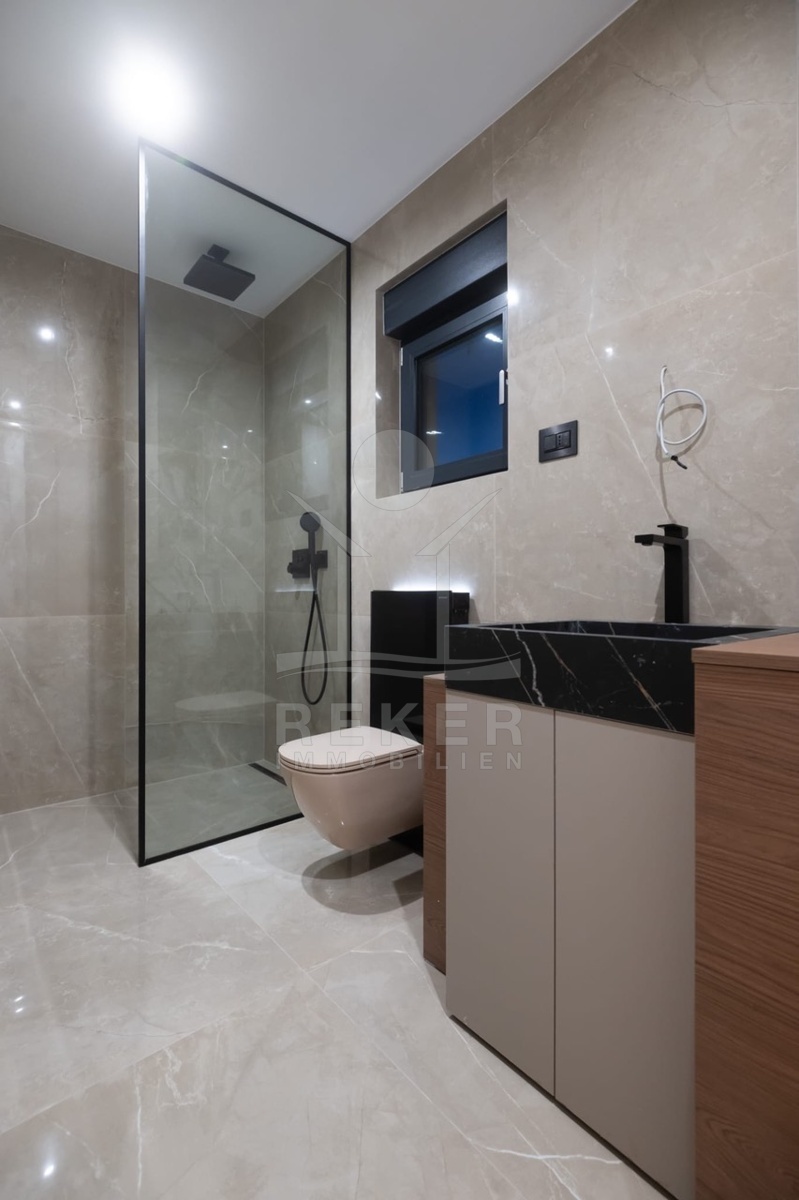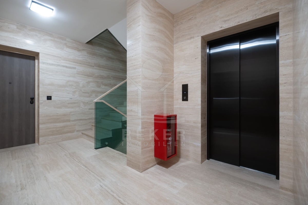 Das Gebäude fügt sich natürlich in seine Umgebung ein. Nur sechs Wohnungen auf drei Etagen bieten Privatsphäre und Großzügigkeit. Jede Einheit profitiert von der südlichen Ausrichtung und viel Tageslicht. POROTHERM-Ziegel mit verstärkter Armierung sorgen für Stabilität und gesundes Raumklima. Große Glas-Schiebetüren im REHAU-System bringen Helligkeit und Offenheit in jeden Raum. Das STO-Fassadensystem schützt dauerhaft und unterstreicht das klare Design. Römischer Travertin mit warmer Struktur akzentuiert Balkone und Treppen und betont den mediterranen Stil. Ein Aufzug verbindet alle Etagen und sorgt für bequemen Zugang. Ein Abstellraum und ein Stellplatz in der Tiefgarage ergänzen den Komfort.
