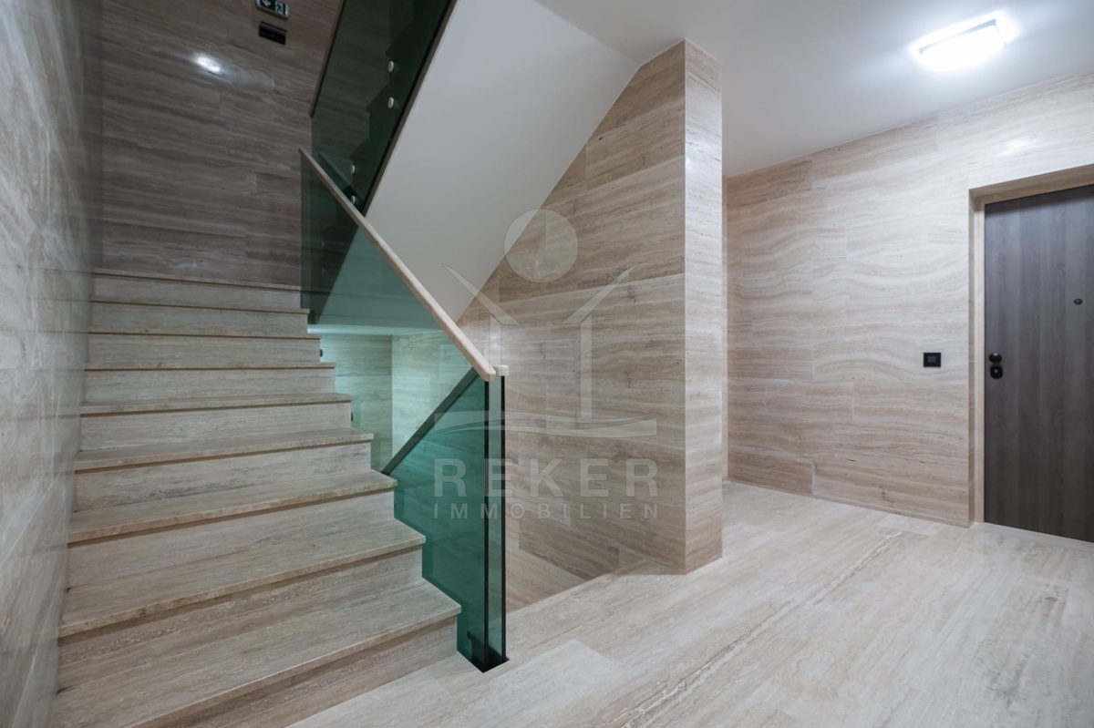 Das Gebäude fügt sich natürlich in seine Umgebung ein. Nur sechs Wohnungen auf drei Etagen bieten Privatsphäre und Großzügigkeit. Jede Einheit profitiert von der südlichen Ausrichtung und viel Tageslicht. POROTHERM-Ziegel mit verstärkter Armierung sorgen für Stabilität und gesundes Raumklima. Große Glas-Schiebetüren im REHAU-System bringen Helligkeit und Offenheit in jeden Raum. Das STO-Fassadensystem schützt dauerhaft und unterstreicht das klare Design. Römischer Travertin mit warmer Struktur akzentuiert Balkone und Treppen und betont den mediterranen Stil. Ein Aufzug verbindet alle Etagen und sorgt für bequemen Zugang. Ein separater Abstellraum sorgt für Stauraum, der Tiefgaragenplatz für Komfort und Sicherheit.