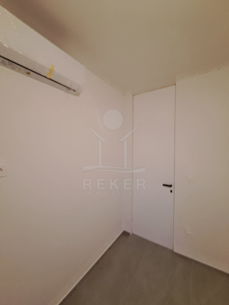Im Inneren erwarten Sie 58 m² Wohnfläche mit einem hellen Wohnzimmer, zwei Schlafzimmern und zwei vollständig ausgestatteten Badezimmern. Glänzende Keramikfliesen und eine elektrische Fußbodenheizung sorgen für modernen Komfort. Jede der drei Räume verfügt über eine eigene Klimaanlage. Fenster mit elektrischen Rollläden, Moskitonetzen und dreifach verglastem IZO-LOW-Glas runden das hochwertige Gesamtbild ab.