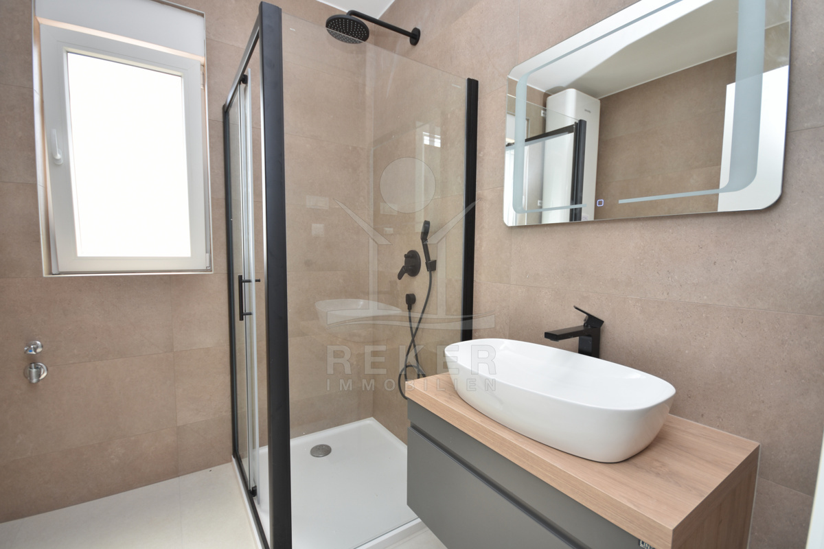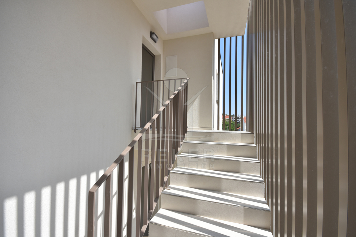 Die Wohnung liegt im 2. Stock eines eleganten Wohngebäudes und bietet eine Wohnfläche von 89 m² und exklusive Ausstattungsmerkmale wie PVC-Zimmerei, elektrische Jalousien, Moskitonetze, italienische Keramikböden und modernste Badezimmerarmaturen. Die Fußbodenheizung sorgt für Behaglichkeit, während die Klimaanlagen in den Schlafzimmern und im Wohnzimmer für angenehme Temperaturen sorgen. Mit zwei Parkplätzen und einem Abstellraum (13 m²) im Keller bietet dieses Penthouse sowohl Luxus als auch praktische Annehmlichkeiten.