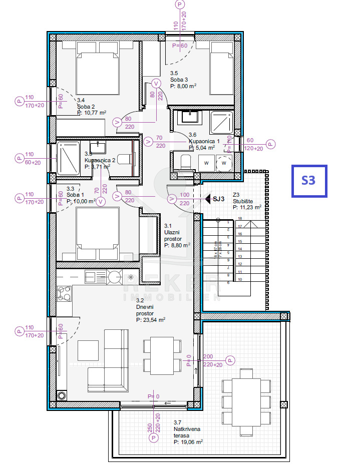 Die praktische Raumaufteilung des Penthouses besticht mit einem Eingangsbereich, 3 Schlafzimmern und 2 Bädern, wobei 1 Schlafzimmer über ein eigenes Bad verfügt. Der offene Wohnbereich integriert einen Ess- und Küchenbereich, der ideal für Zusammenkünfte und gemeinsame Mahlzeiten ist. Eine überdachte Terrasse mit 19 m² erweitert den Wohnraum nach draußen und lädt dazu ein, die frische Luft zu genießen und im Freien Zeit zu verbringen.