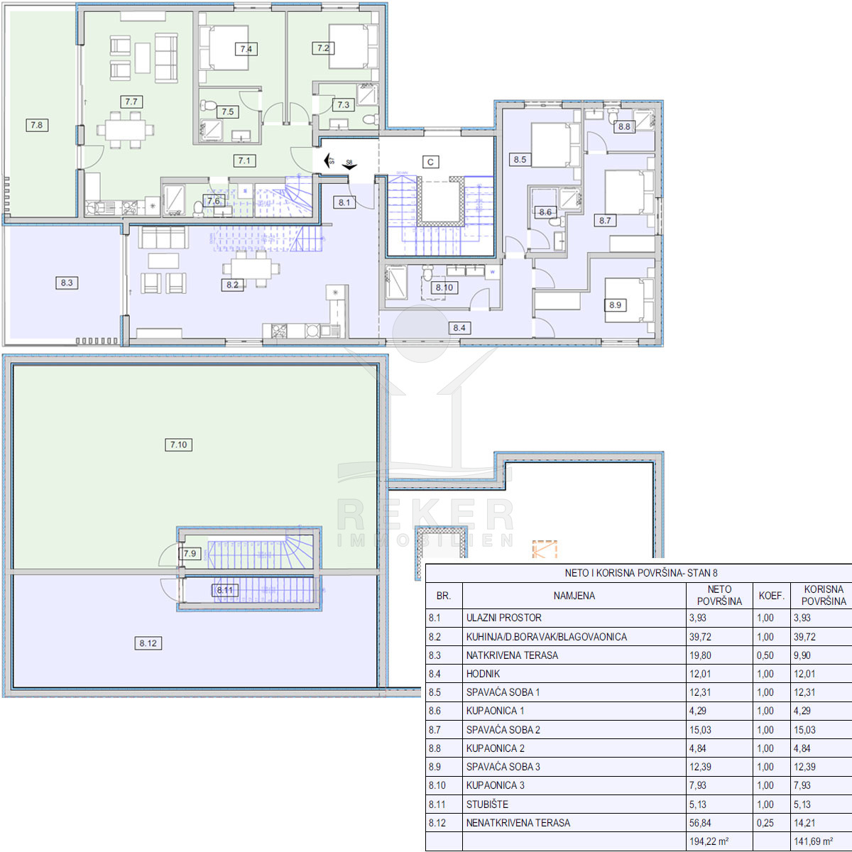 Das Gebäude hat acht Wohnungen, verteilt auf drei Etagen und ein Flachdach. Im Erdgeschoss gibt’s Gärten, ab dem ersten Stock freie Sicht aufs Meer. Modernes Design, klare Linien, helle Fassade. Die oberen Wohnungen mit Balkon, ganz oben sogar mit großer Dachterrasse. Jeder Wohneinheit ist ein Parkplatz zugeordnet. Fertigstellung ist für Herbst 2026 geplant.