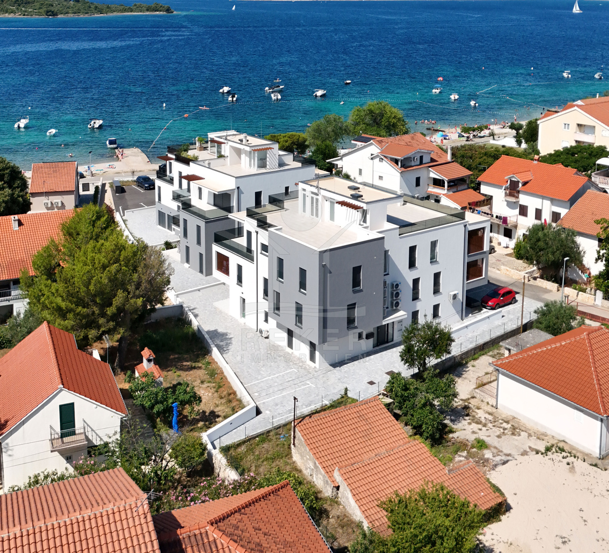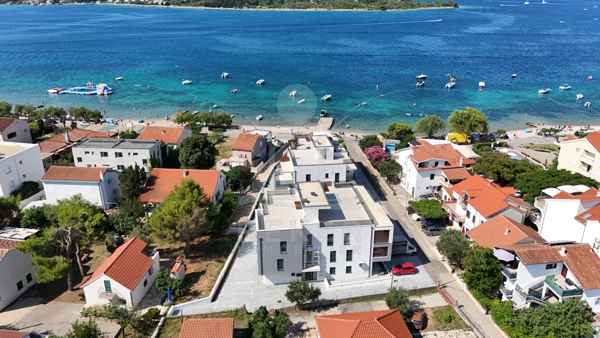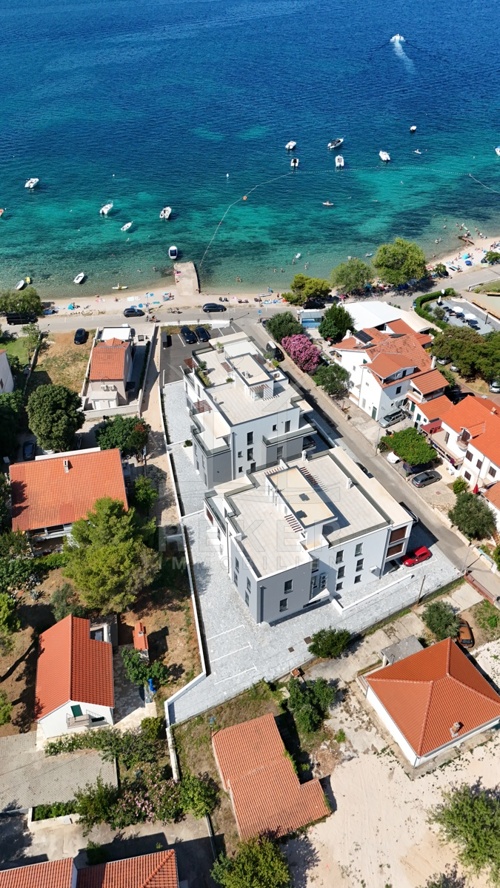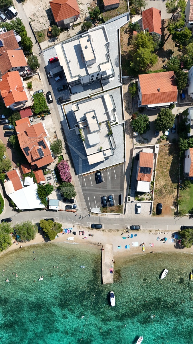 In Vodice, in einem gefragten Ortsteil, wohnen Sie in zweiter Reihe zum Strand. Das Meer erreichen Sie nach 50 Metern, das Zentrum nach rund 600 Metern. Kurze Wege zum Baden, schnelle Erreichbarkeit von Geschäften und Restaurants. Ein eigener Parkplatz gehört zur Wohnung. Das Haus mit nur 8 Einheiten entstand zwischen 2022 und 2023 und schafft eine angenehm private Atmosphäre.