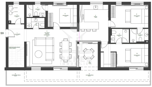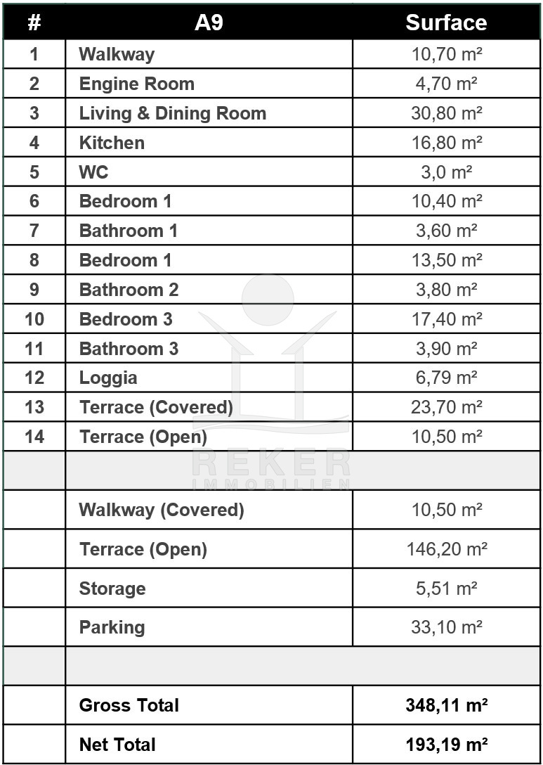 Der Wohn- und Essbereich misst über 30 m². Viel Raum, viel Licht. Daneben die offene Küche – mit 16,8 m² großzügig geschnitten. Drei Schlafzimmer, drei Bäder. Jedes Zimmer hat seinen eigenen Bereich. Ideal für Familien oder Gäste. Zwei Außenflächen sind direkt von der Wohnung aus erreichbar: eine überdachte Terrasse mit 23,7 m² und eine offene Terrasse mit 10,5 m² Zusätzlich gibt es ein separates Gäste-WC. Und Stauraum ist auch vorhanden: der Technikraum liegt gleich am Eingang.